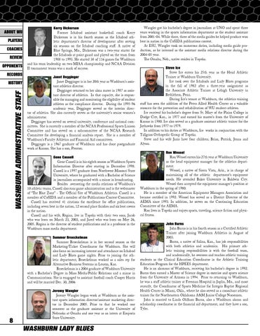 Kerry Dickerson Former Ichabod assistant basketball coach Kerry Dickerson is in his fourth season as the Ichabod athletic department’s director of development after serving six seasons on the Ichabod coaching staff. A native of Blue Springs, Mo., Dickerson was a two-year starter for the Ichabods at point guard and played on the team from 1988 to 1993. He started 38 of 116 games for Washburn and his team leadership on two MIAA championship and NCAA Division II tournament teams was a mark of success. Janet Degginger Janet Degginger is in her 20th year as Washburn’s assistant athletics director. Degginger returned to her alma mater in 1987 as assistant director of athletics. In that capacity, she is responsible for managing and monitoring the eligibility of student athletes as the compliance director. During the 1995-96 academic year, Degginger served as the interim director of athletics. She also currently serves as the university’s senior women’s administrator. Degginger has served on several university, conference and national committees. She is currently a member of the NCAA Professional Sports Liaison Committee and has served on a subcommittee of the NCAA Research Committee for developing a financial analysis report. She is a member of Washburn’s Faculty Athletics and Financial Aid committees. Degginger is a 1967 graduate of Washburn and has done postgraduate work at Kansas. She has a son, Preston. Gene Cassell Gene Cassell is in his eighth season as Washburn Sports Information Director after starting in December 1998. Cassell is a 1997 graduate from Northwest Missouri State University, where he graduated with a Bachelor of Science in journalism accompanied with a minor in broadcasting. Besides overseeing the media relations of Washburn’s 10 athletic teams, Cassell also runs game administration and is the webmaster of “The Blue Zone” - The Official Site of Washburn Athletics. Cassell is a member of CoSIDA and a member of the Publications Contest Committee. Cassell has received 41 citations for excellence for office publications, including seven best in the nation, 12 second place finishes and six best covers in the nation. Cassell and his wife, Regina, live in Topeka with their two sons, Jacob who was born on March 23, 2003, and Jared who was born on May 26, 2005. Regina is the director of student publications and is a professor in the Washburn mass media department. Summer Broeckelman Summer Broeckelman is in her second season as the Marketing/Ticket Coordinator for Washburn. She will also focus on increasing interest and attendance on Ichabod and Lady Blues game nights. Prior to joining the athletic department, Broeckelman worked as a sales rep for Alternative Business Systems in Lenexa, Kan. Broeckelman is a 2004 graduate of Washburn University with a Bachelor’s Degree in Mass Media/Public Relations and a minor in Communications. She is enagaged to assistant football coach Cooper Harris and will be married Dec. 30, 2006