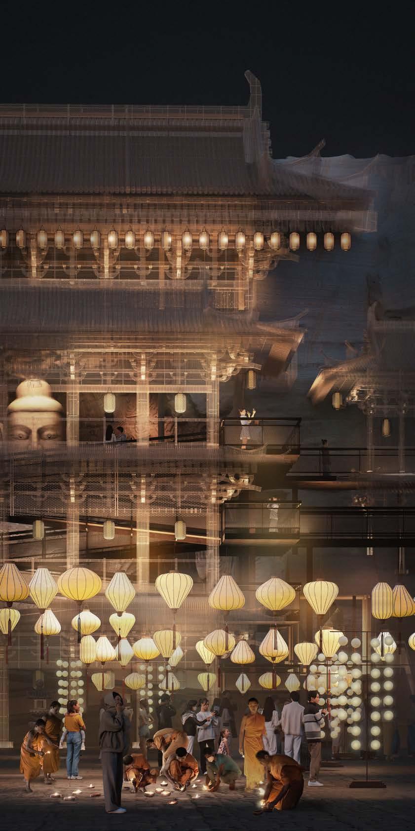 This project aims to reintegrate the cultural essence, activities, and craftsmanship of the Buddhist grottoes and their protective architecture into the site while balancing physical protection and visual appreciation. The design features multilayered steel walkways, traditional timber roofs, and lightweight mesh enclosures, offering novel perspectives and safeguarding the grottoes. This approach creates a harmonious interface between past and present, allowing visitors to appreciate the site's intricate details and natural landscape.