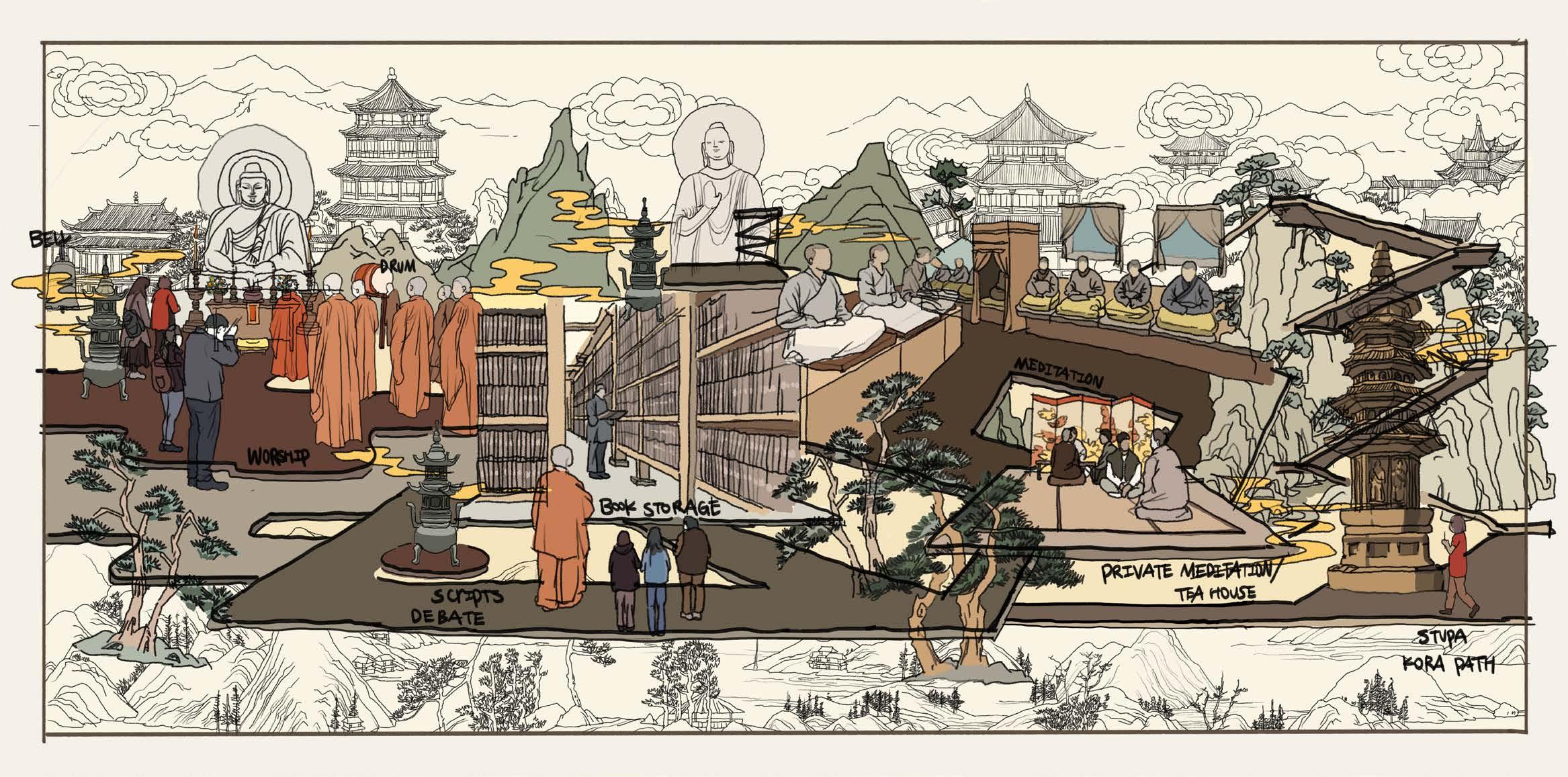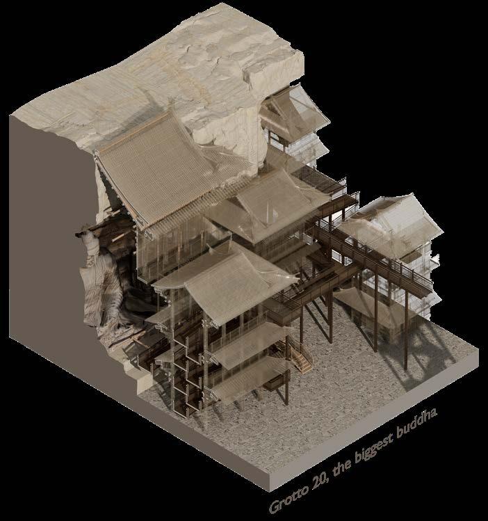 The present past is grounded in the concept of the living conservation of religious heritage - Buddhist Grottoes, specifically focusing on the Yungang Grottoes, a paramount example of Northern Wei Dynasty (386-534 AD) juxtaposition between local settlements and religious practice and belief system. Confronted with the gradual spiritual and physical deterioration of the grottoes, this project critiques the current conservation management in place and re-imagines our relationship with heritage, exploring how we can co-inhabit with religious and urban heritage. By transforming the Grottoes into a space where history, culture, and community converge, the project seeks to maintain the site's significance for future generations.