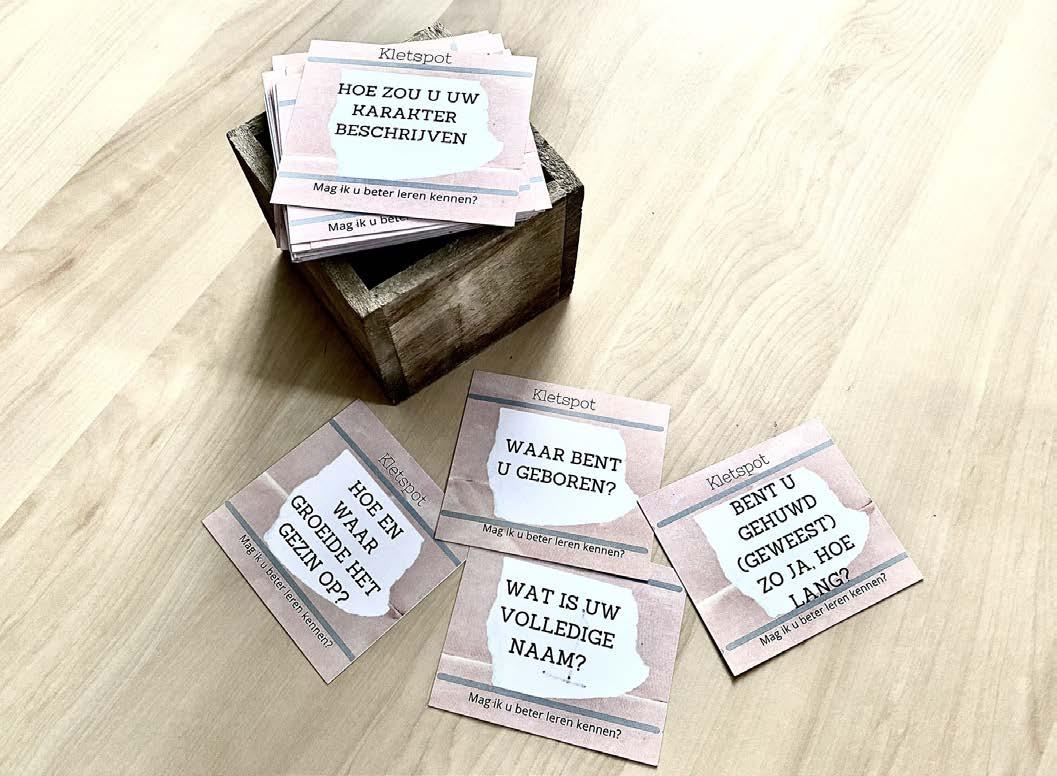 Vanuit deze methode is een Kletspot Levensverhaal gemaakt door Roxanne Thumann (activiteitenbegeleider). Een spel waarbij je het gesprek met elkaar op gang helpt. In deze pot zitten verschillende vragen die betrekking hebben op het