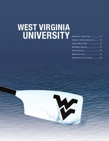 President E. Gordon Gee.......................72 Director of Athletics Oliver Luck.............73 Athletics Senior Staff..............................74 WVU Head Coaches...............................75 Athletic Facilities....................................76 Media Information..................................77 WVU Sports Communication.................78