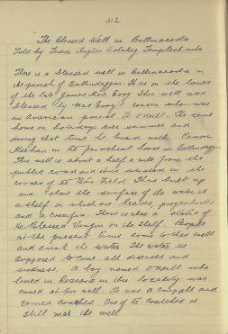 “There is a blessed well Ballincoola in the Parish of Ballindaggin. It is on the lands of the late James MacEvoy. This well was blessed by MacEvoy’s cousin who was an American priest, Fr. O Neill The Well is about a half a mile from the public road and it is situated in the corner of the Ban Field. This built up and above the surface of the water is a shelf on which there are beads, prayerbooks and a crucifix. There is also a statue of the Blessed Virgin on the shelf. People at the present time come to this Well and drink the water. The water is supposed to cure all diseases and sickness. A boy named O Neill who lived in Rossard in the locality was cured at this Well. He was a cripple and carried crutches. One of the crutches is still near the well.” - Teresa Hughes, Bolabeg 1933