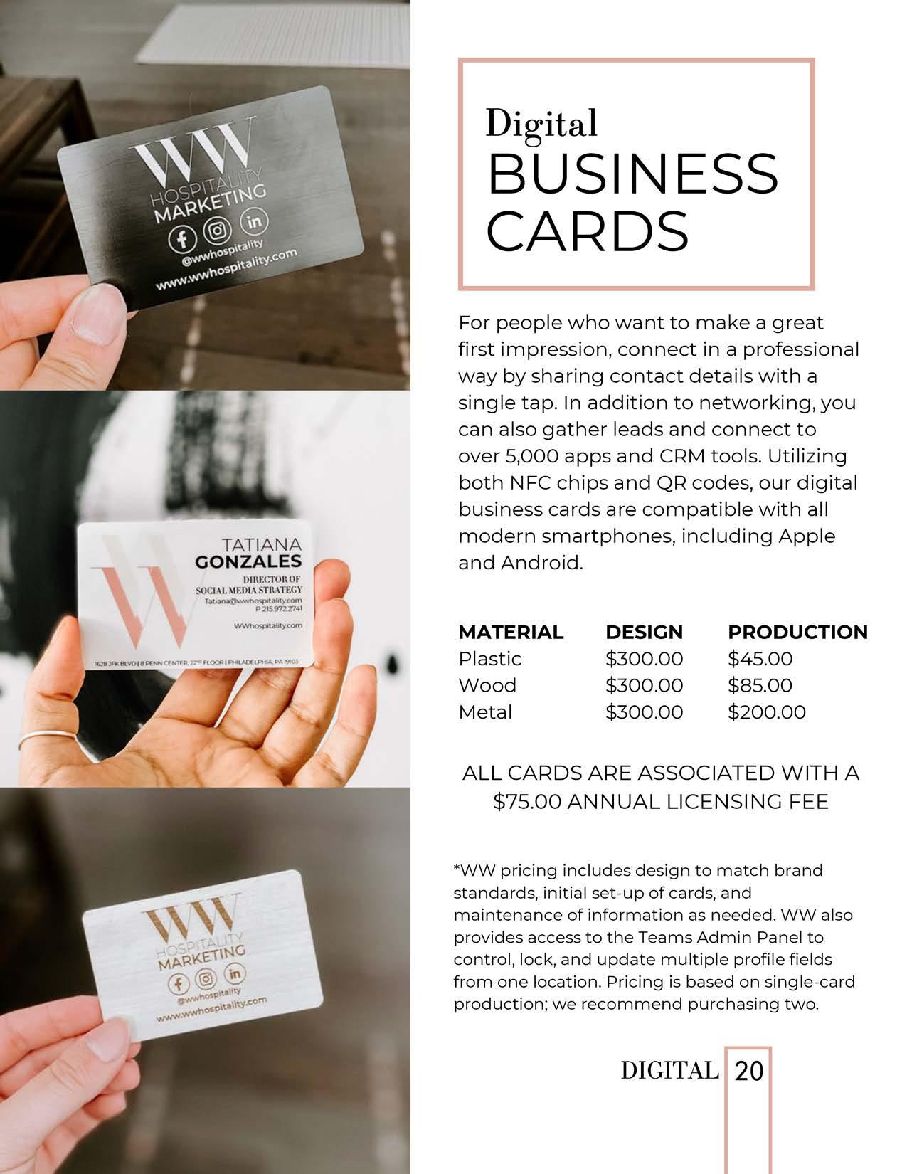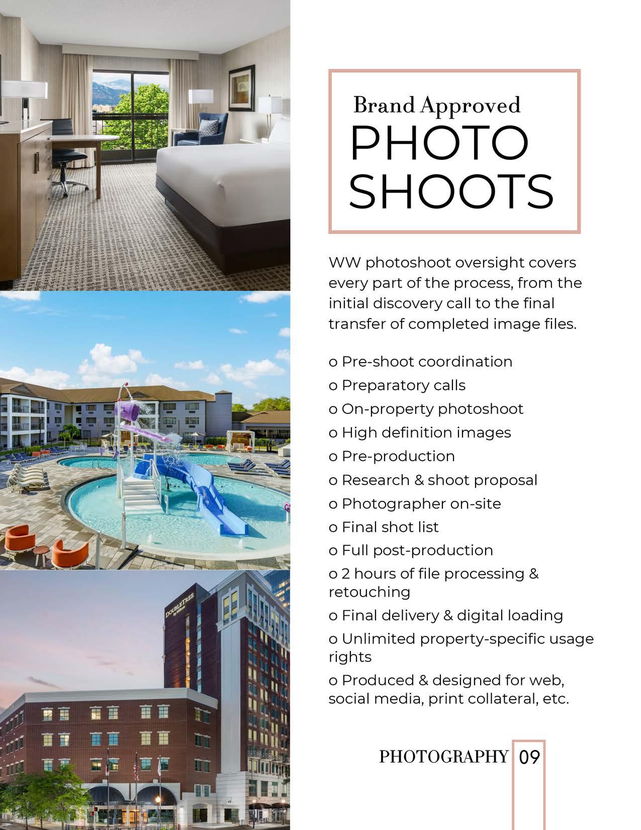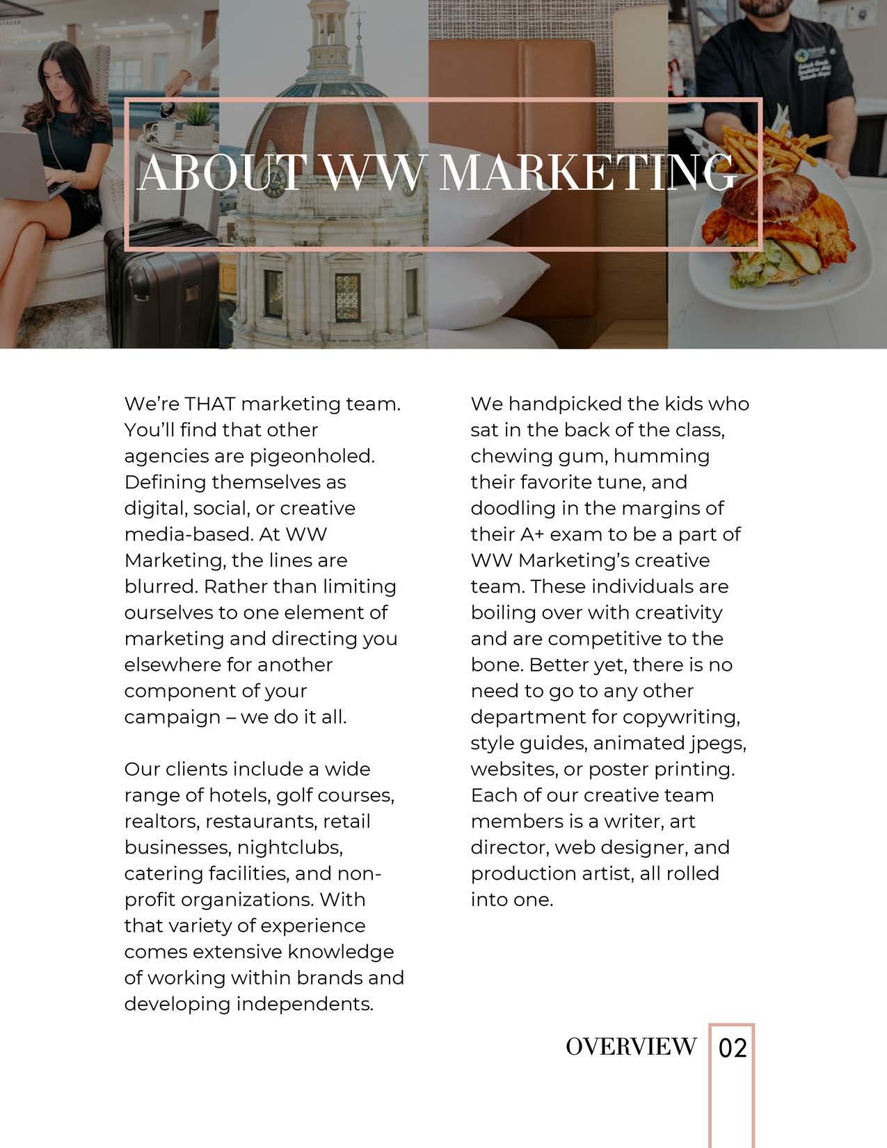 a comprehensive catalog detailing WW Hospitality Marketing’s full range of creative, digital, and strategic services for hospitality clients. It outlines annual planning tools, collateral design pricing, photography packages, digital marketing initiatives, and social media management tiers. The document serves as both a capabilities brochure and pricing reference, highlighting WW’s all-inclusive approach to marketing for hotels, restaurants, golf clubs, and related industries.