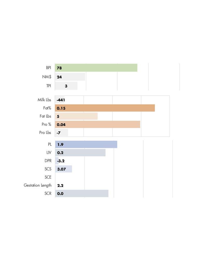 PHYSICAL TRAIT EVALUATION PTAT: 1.20 JUI: 8.70 JPI: 60 7JE01838 CDCB/AJCA Genetic Eval. 04-24 6 dtrs. 5 herds 83% Rel. INDEXES PRODUCTION HEALTH AND FERTILITY TRAITS 25% 50% 75% 100% Bottom 25% 25%-50% 50%-75% Top 25%