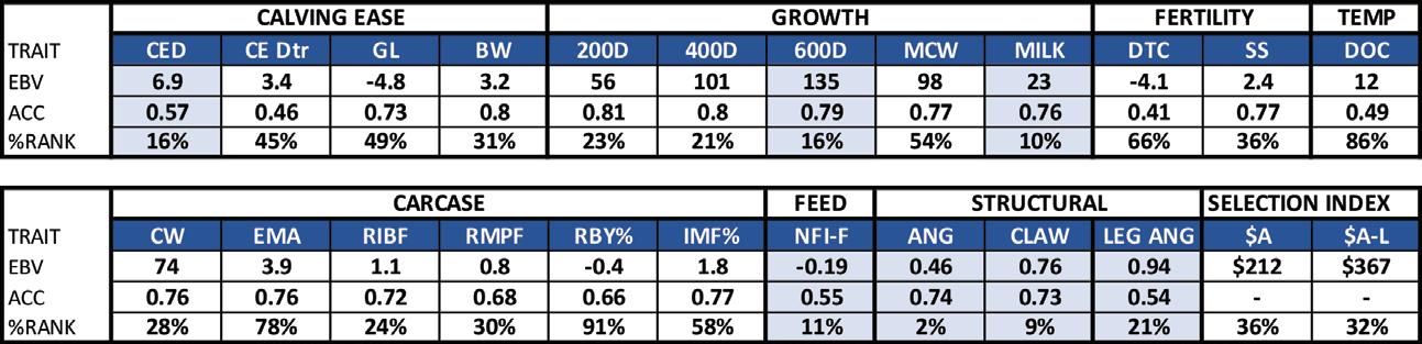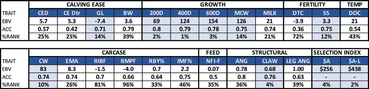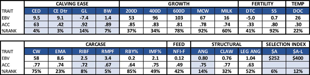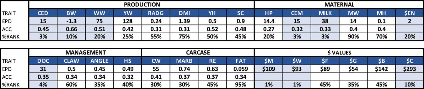 • Offers an elite EPD profile ranking in the top 5 percent of the breed for eight different traits and all three indexes
