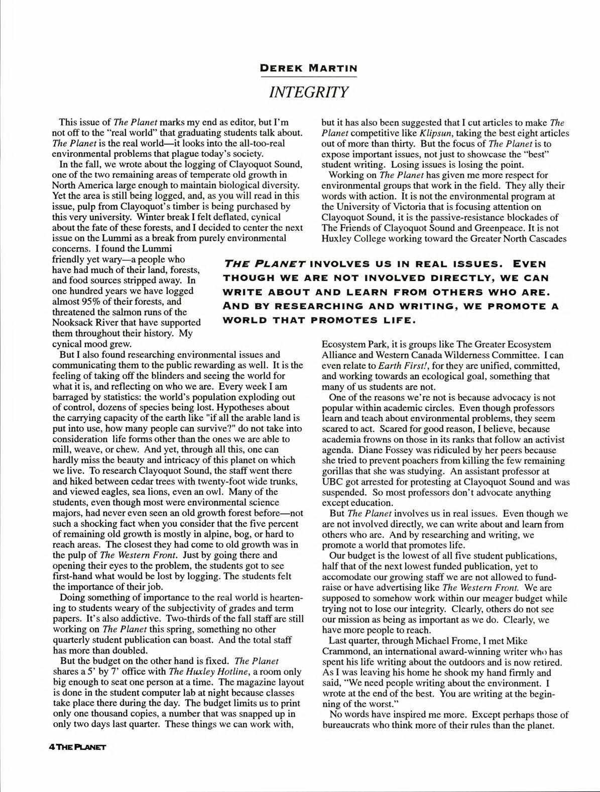 but it has also been suggested thatI cut articles to make The Planet competitive like Klipsun, taking the best eight articles out ofmore than thirty. But the focus of The Planet is to expose important issues, notjust to showcase the “best’’ student writing. Losing issues is losing the point. Working on The Planet has given me more respect for environmental groups that work in the field. They ally their words with action. It is not the environmental program at the University ofVictoria that is focusing attention on Clayoquot Sound, it is the passive-resistance blockades of The Friends of Clayoquot Sound and Greenpeace. It is not Huxley College working toward the Greater North Cascades THE Planet \nwou\r^s us in real, issues. Even THOUGH WE ARE NOT INVOLVED DIRECTLY, WE CAN WRITE ABOUT AND LEARN FROM OTHERS WHO ARE. And by researching and writing, we promote a WORLD THAT PROMOTES LIFE. Ecosystem Park, it is groups like The GreaterEcosystem Alliance and Western CanadaWilderness Committee. I can even relate to Earth First!, forthey areunified, committed, and working towards an ecologies goal, something that many ofus students are not. One ofthe reasons we’re not is because advocacy is not popular within academic circles. Even though professors learn and teach about environmental problems, they seem scared to act. Scared forgood reason, I believe, because academia frowns on those in its ranks that follow an activist agenda. Diane Fossey was ridiculed by her peers because she tried to prevent poachers fromkilling the few remaining gorillas that she was studying. An assistant professor at UBC got arrested for protesting at Clayoquot Sound and was suspended. So most professors don’t advocate anything excepteducation. But The Planet involves us in real issues. Even though we are not involved directly, we can write about and learn from others who are. And by researching and writing, we promote a world that promotes life. Our budget is the lowest of all five student publications, halfthat ofthe next lowest funded publication, yet to accomodate our growing staffwe are not allowed to fundraise orhave advertising like The Western Front. We are supposed to somehow work within our meager budget while trying not to lose our integrity. Clearly, others do not see our mission as being as important as we do. Clearly, we have more people to reach. Last quarter, throughMichael Frome, I metMike Crammond, an international award-winning writer who has spent his life writing about the outdoors and is now retired. As I was leaving his home he shook my hand firmly and said, “We need people writing about the environment. I wrote at the end ofthe best. You are writing at the beginning ofthe worst.’’ No words have inspired me more. Except perhaps those of bureaucrats who think more oftheirrules than the planet.
