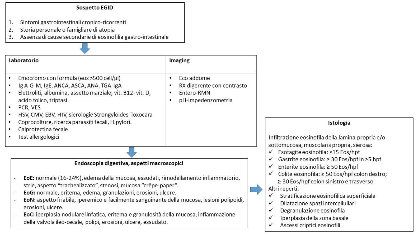 Spesso le EGID si accompagnano ad atopia e autoimmunità. Nel tratto gastrointestinale gli eosinofili sono normalmente presenti a livello della lamina propria della mucosa, con un ruolo nei meccanismi di difesa immunitaria, in particolare contro le infestazioni parassitarie e nelle allergie alimentari, aumentando e venendo attivati in caso di infiammazione. Nei casi di EGID, l’esame istologico rileva un elevato numero di eosinofili attivati, con segni di degranulazione, attivazione delle mastcellule, produzione di citochine (IL-1, IL-3, IL4, IL-5, IL-13, TGF), chemochine (CCL 26), mediatori lipidici (leucotrieni, fattore attivante le piastrine), neuromediatori (sostanza P, polipeptide vasoattivo intestinale) e induzione di una risposta immune di tipo Th2. Gli allergeni alimentari sono possibili fattori scatenanti il processo infiammatorio, in particolare per l’esofagite eosinofila, anche se l’associazione con allergie o atopia è presente solo nel 64% circa dei pazienti affetti. Aspetti di coinvolgimento dell’autoimmunità renderebbero queste patologie eosinofile assimilabili alla categoria delle malattie infiammatori croniche intestinali (MICI).