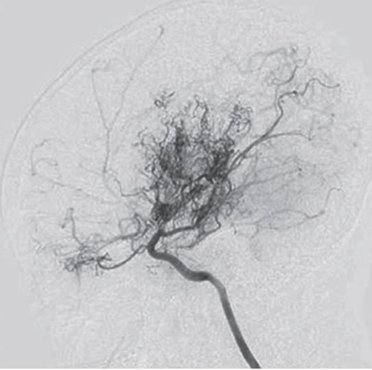 2. Angiografia nella malattia di Moyamoya; appare evidente un restringimento significativo della carotide interna e la presenza caratteristica dei collaterali “a nuvola di fumo” con perfusione corticale ridotta.