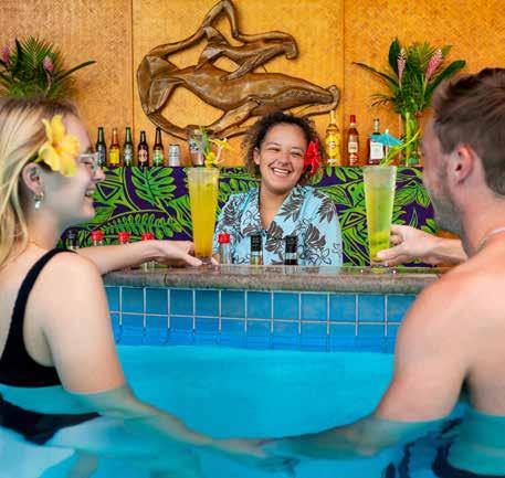 sunset wrasses and many more colourful and approachable tropical fishes. Snorkelling plus stand-up paddleboarding, kayaking, gym, games room and tennis along with fish feeding, learning to husk a coconut, make a fresh flower garland ei, dance the ‘ura (hula), play the ukulele and island log drums, bingo, karaoke, are all complimentary to resort guests at both resorts.