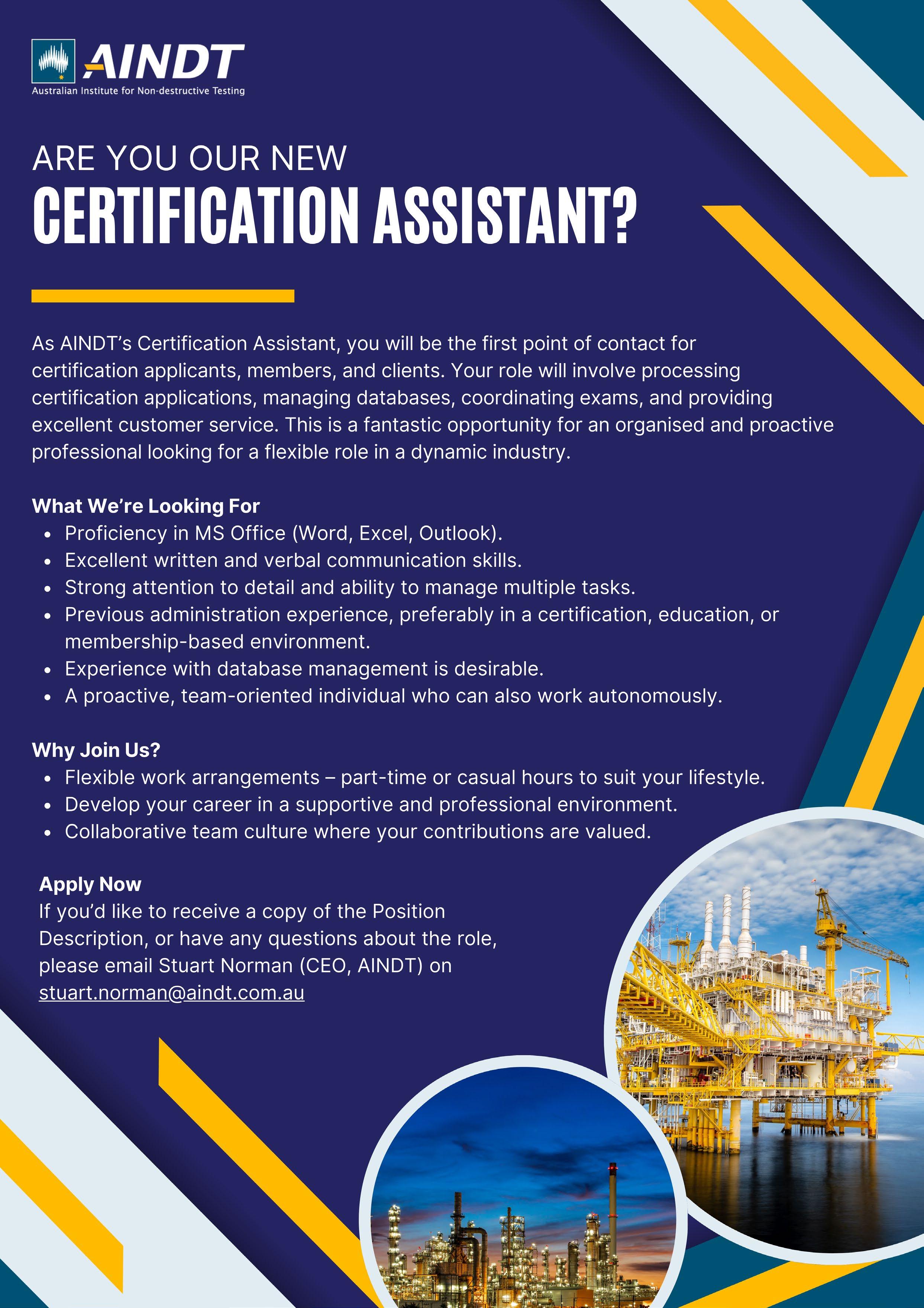 As such, the AINDT Federal Office in Melbourne is seeking to employ a Certification Assistant to join our team. This may be either a part-time or casual position tailored for the right person or people.