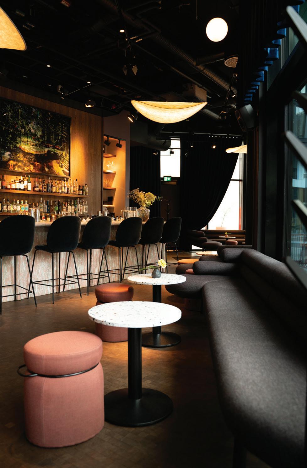 åpnere bar. Vegger er fjernet, men materiale er gjenbrukt, som fløyelsgardinene og veggpanelene samt barstolene. De krediterer Kari Innerå for interiørets vennlige og stilsikre uttrykk.