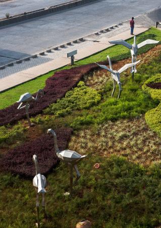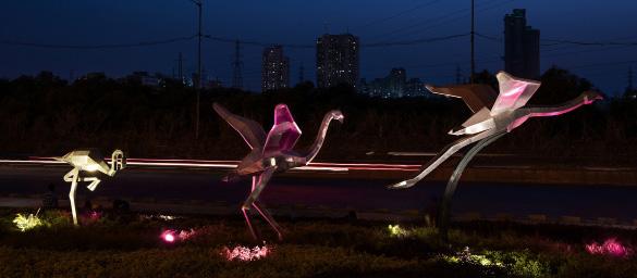 The ‘Flight of the Flamingo ‘, is a landscape design proposal for a set of traffic islands in the suburbs of Mumbai with a visually engaging art installation. It is a not only an aesthetic contribution to the chaotic cityscape but also a tribute to the arduous journey of Flamingos to their endangered second home- the Sewri mudflats in the vicinity.Carefully selected plant material of stark colors and textures planted in an informal, organic manner represented the wilderness of the marshlands