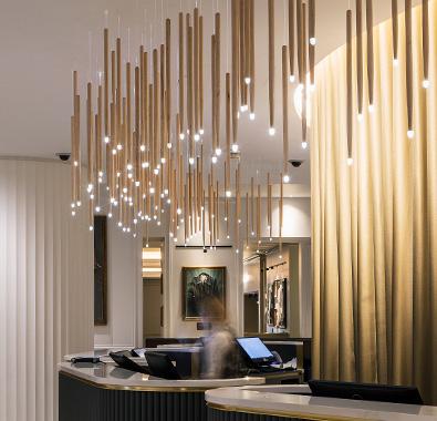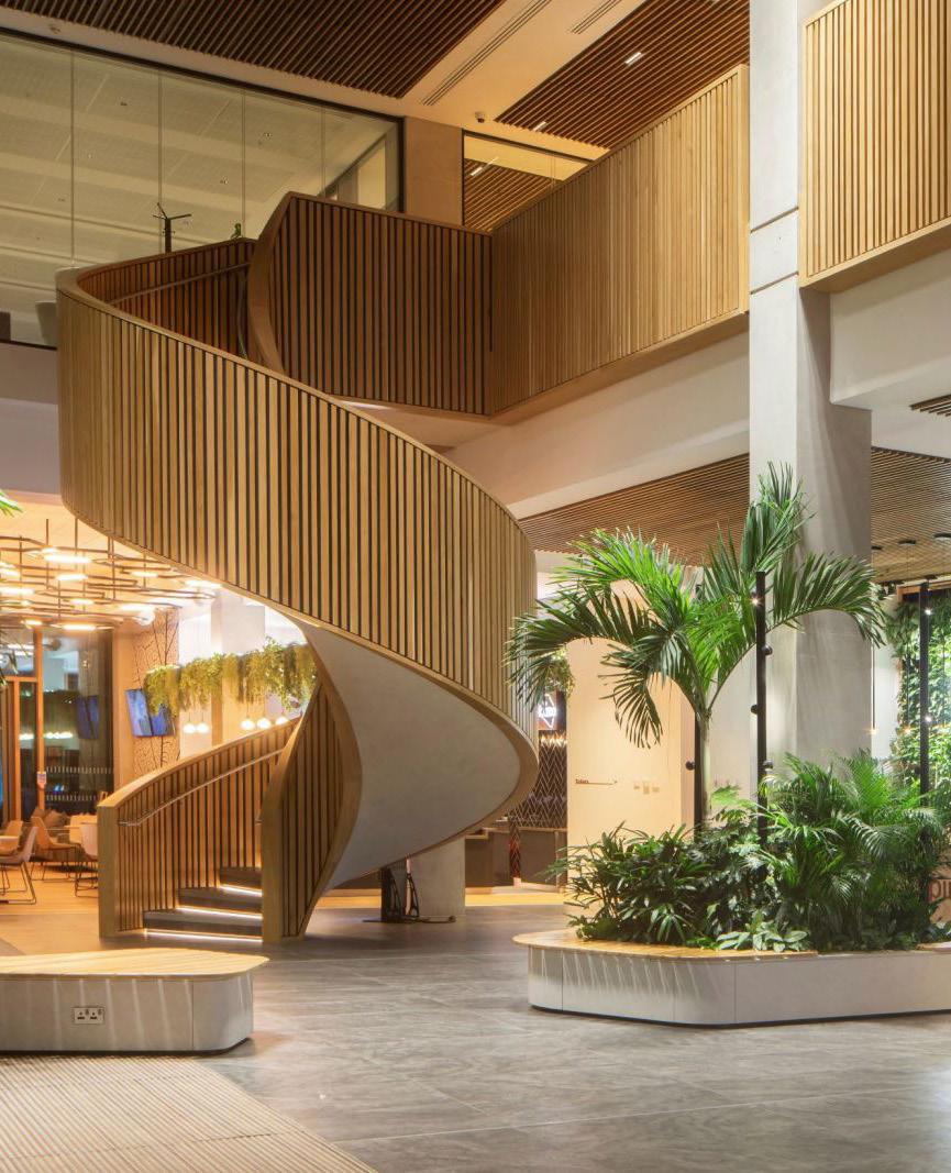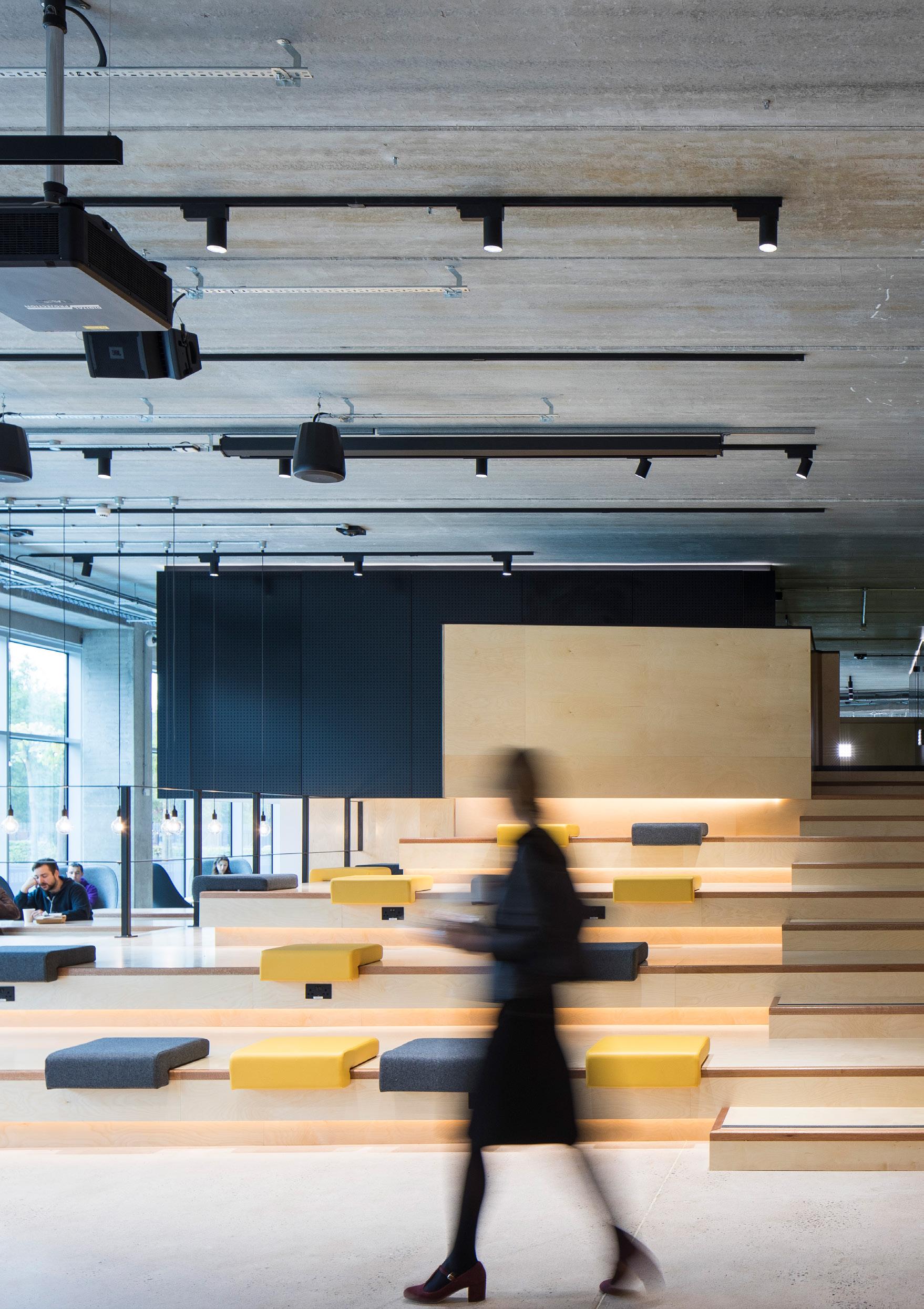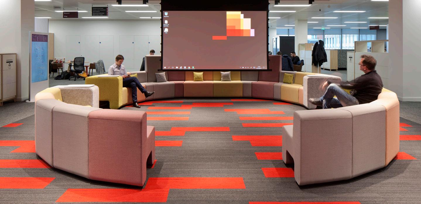 PwC’s Manchester office spreads across four floors of the One Spinningfields building and provides collaborative workspace, flexible meeting pods, a feature staircase with ‘Spanish steps’ style seating, a café and three roof terraces. A strong Manchester identity is conveyed throughout, with its topography, industrial heritage and bee symbolism inspiring the aesthetic.