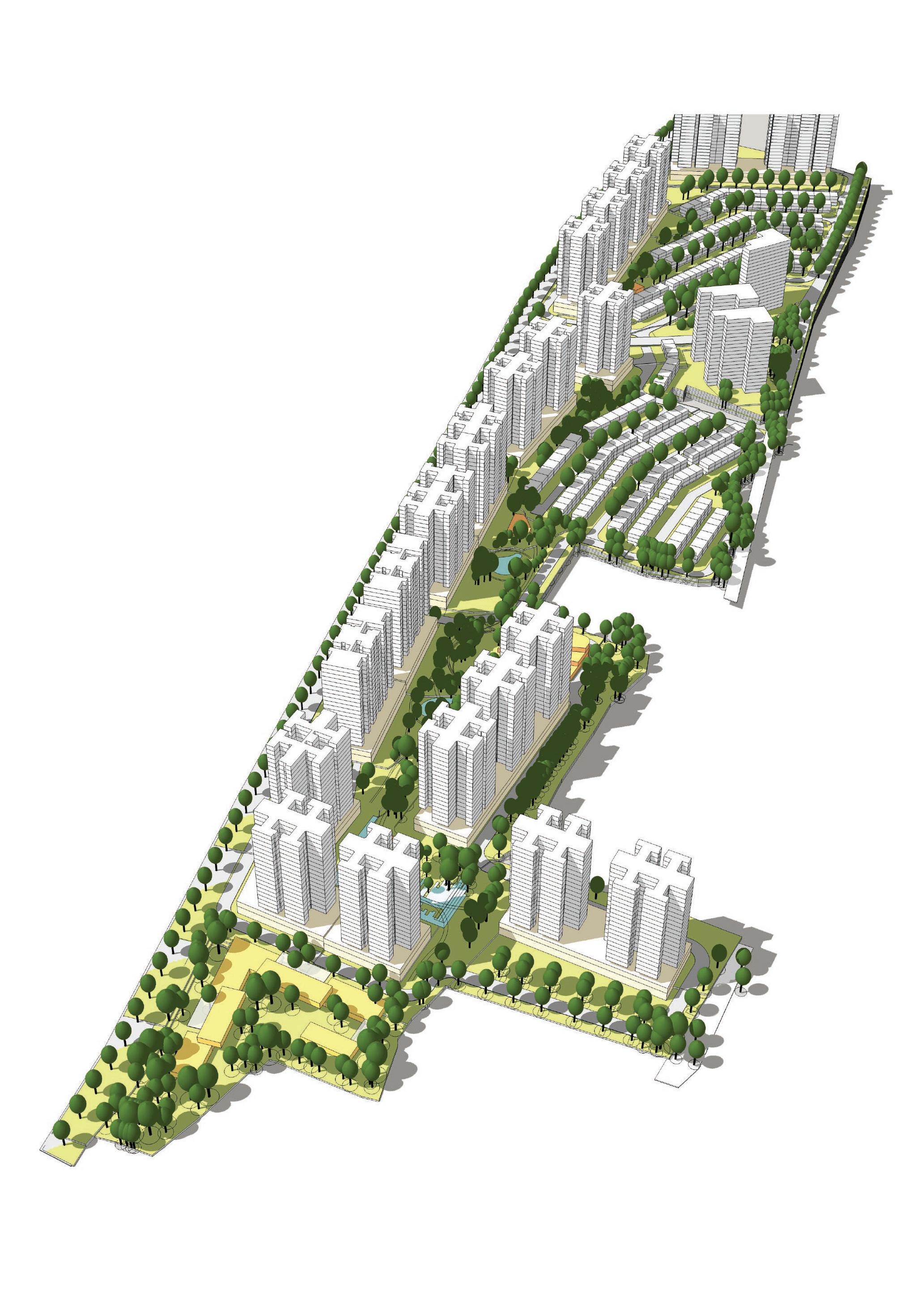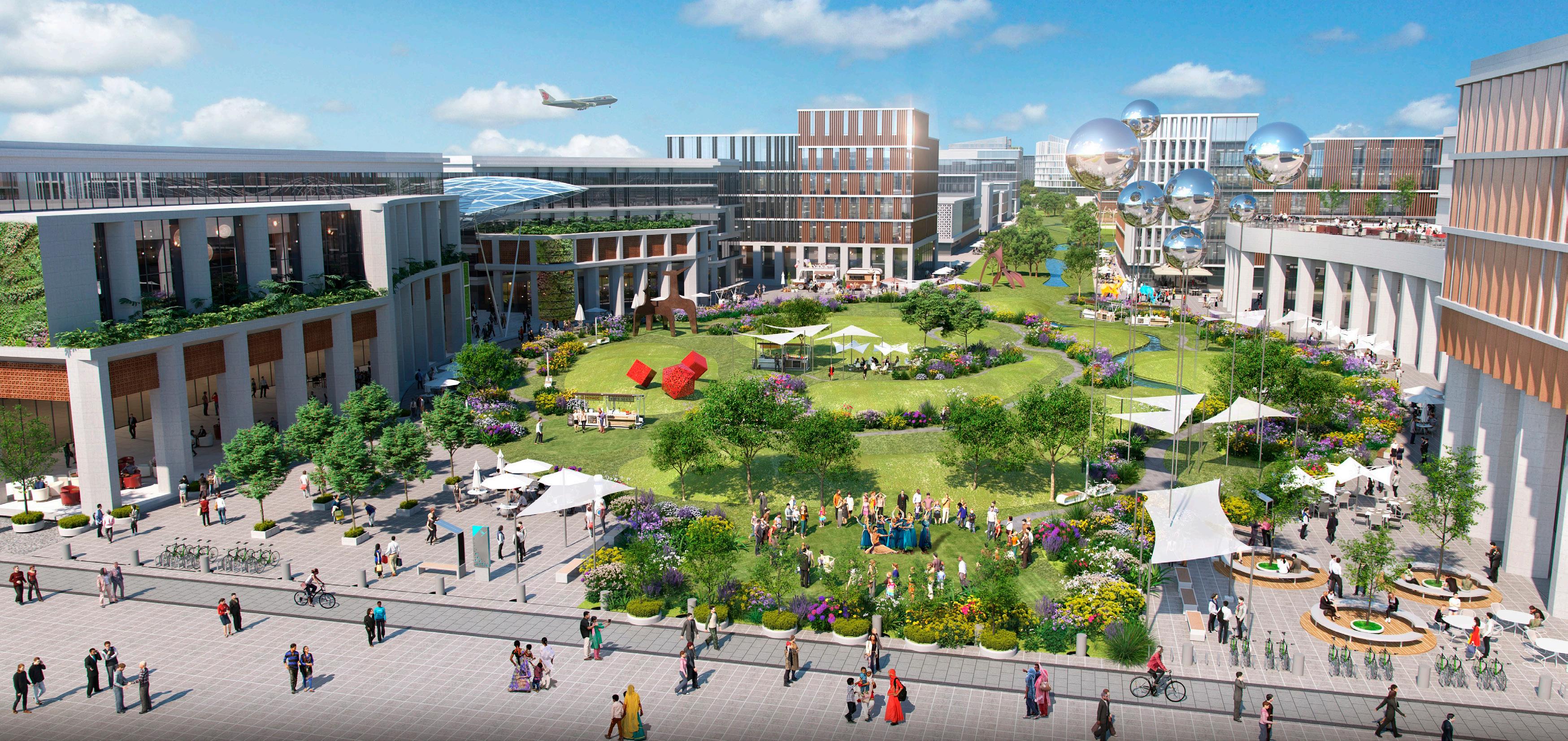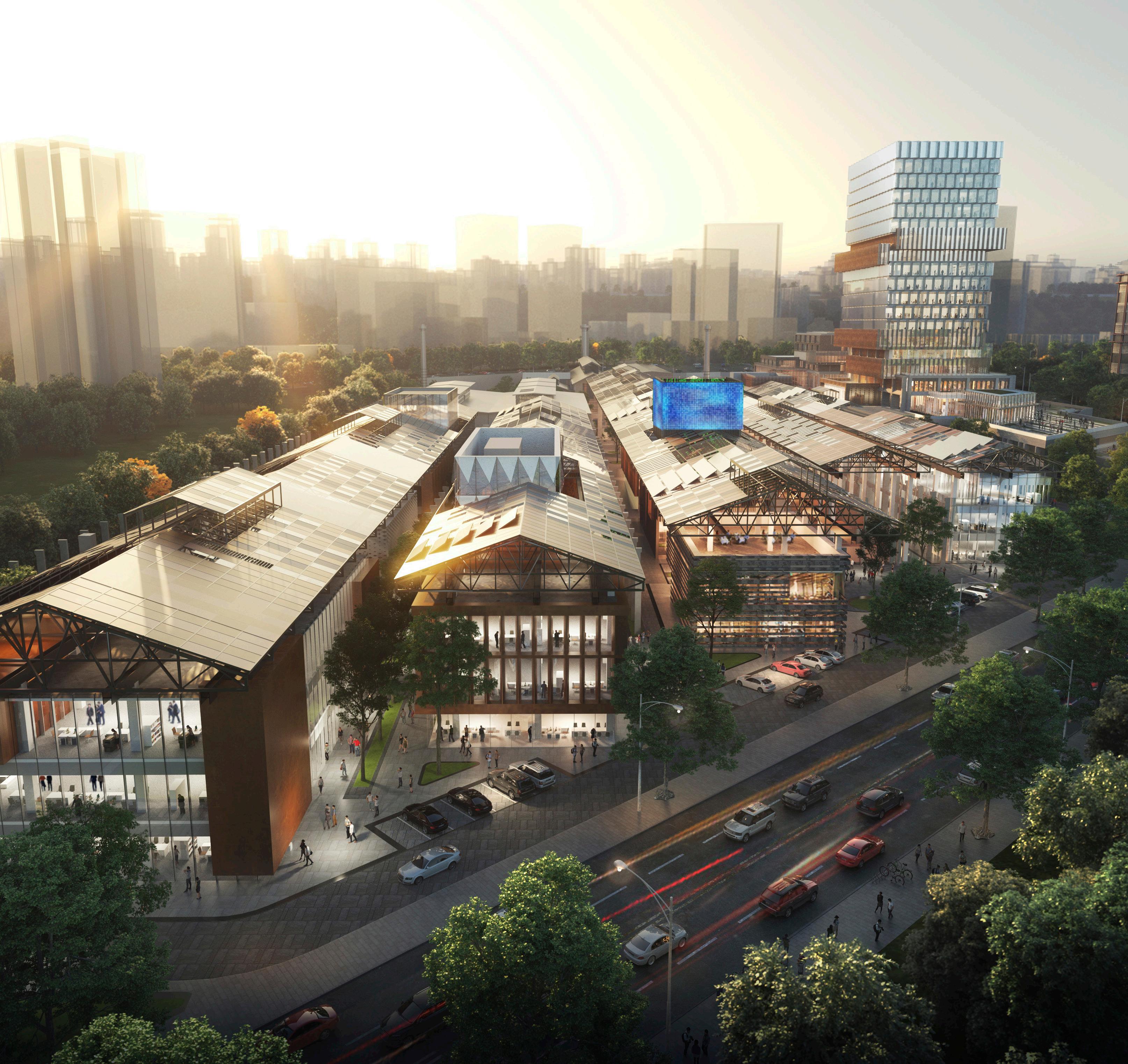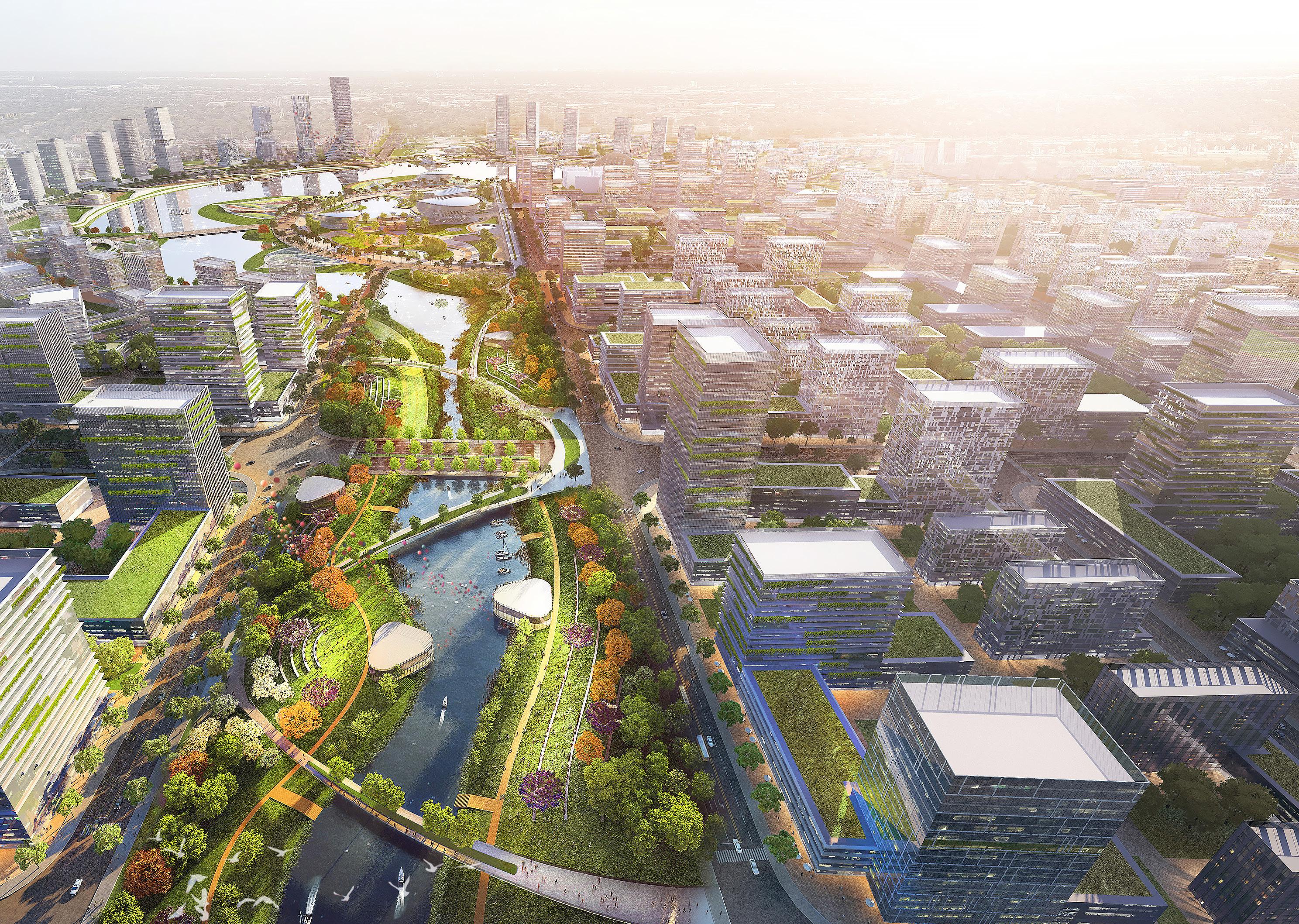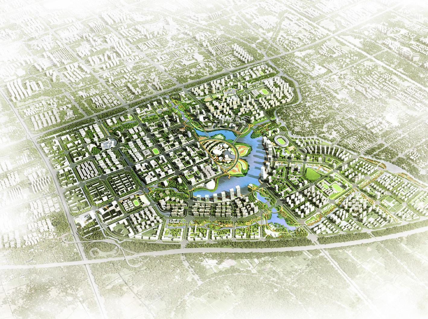 Our designs for the 16 sq km district make maximum use of water, green spaces and eco features including eight parks and new green water networks. A central lake will facilitate transport links and provide a range of leisure activities for both local communities and visitors attracted to the city centre. The lake will be surrounded by an ecological waterfront as well as commercial and cultural buildings. Three green corridors branch off from the lake, connecting surrounding parts of the city which is divided into different education, economic, residential, cultural and leisure zones.