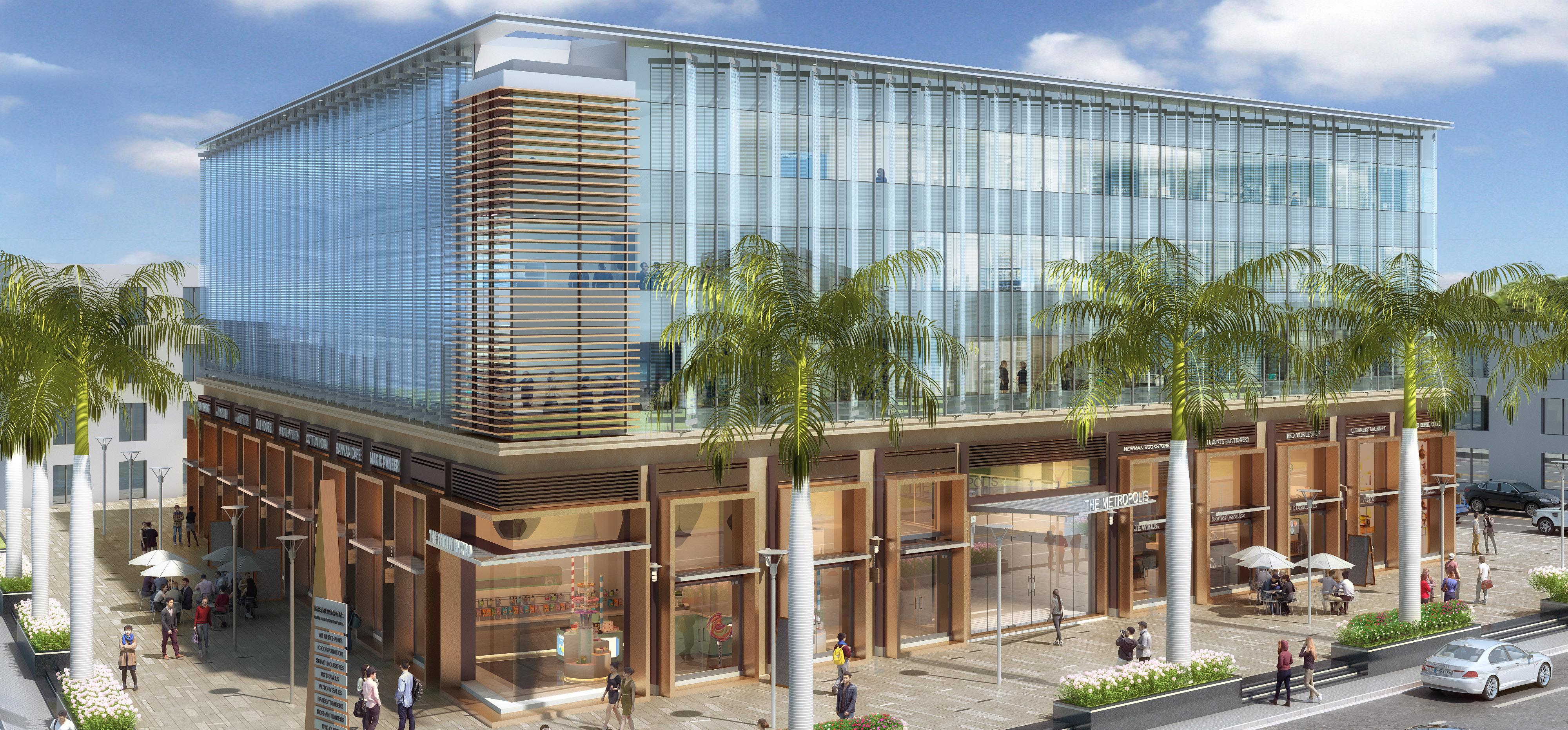 BDP have designed an upcoming 50,000 sqft mixed use, retail and office building in Valsad, Gujarat. The site is situated at a prime location in Valsad, surrounded by the premium industrial and commercial belt of the city. The Metropolis has been designed based on international standards, setting a benchmark for commercial buildings in the area. Our design utilises its street corner site, with double-height retail spaces wrapped on two sides of the building and three floors of office space above.