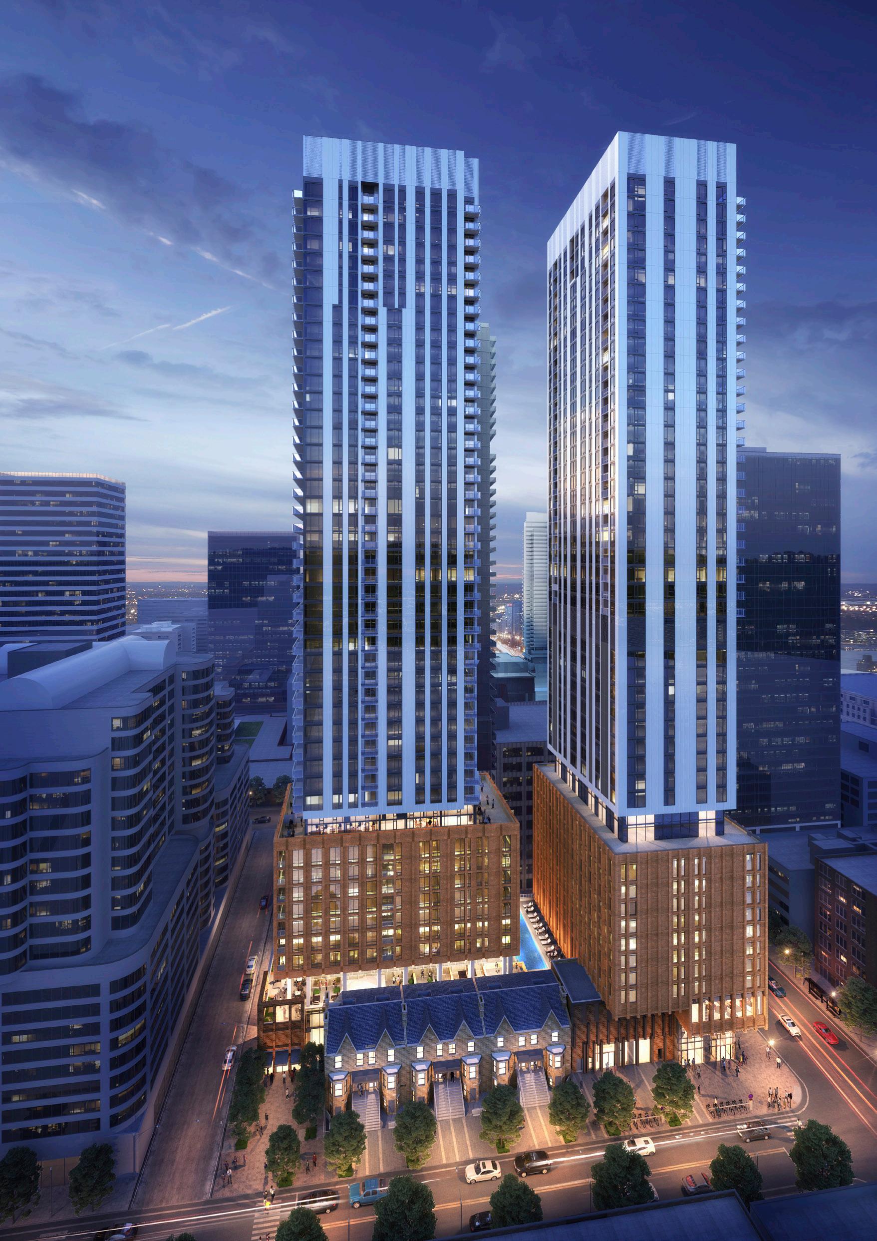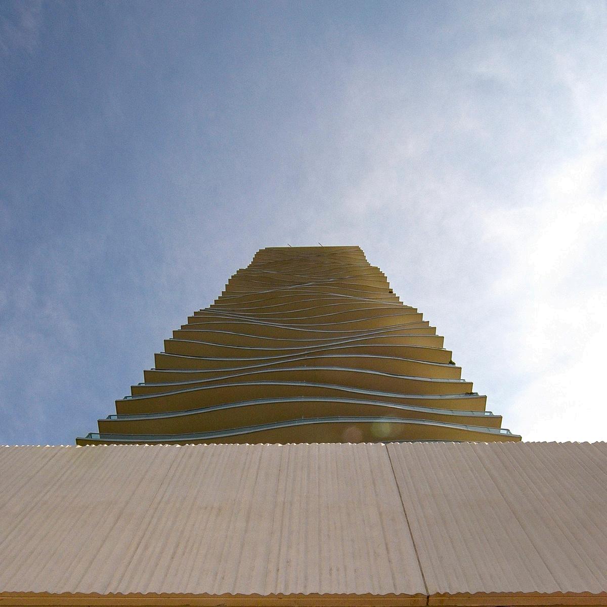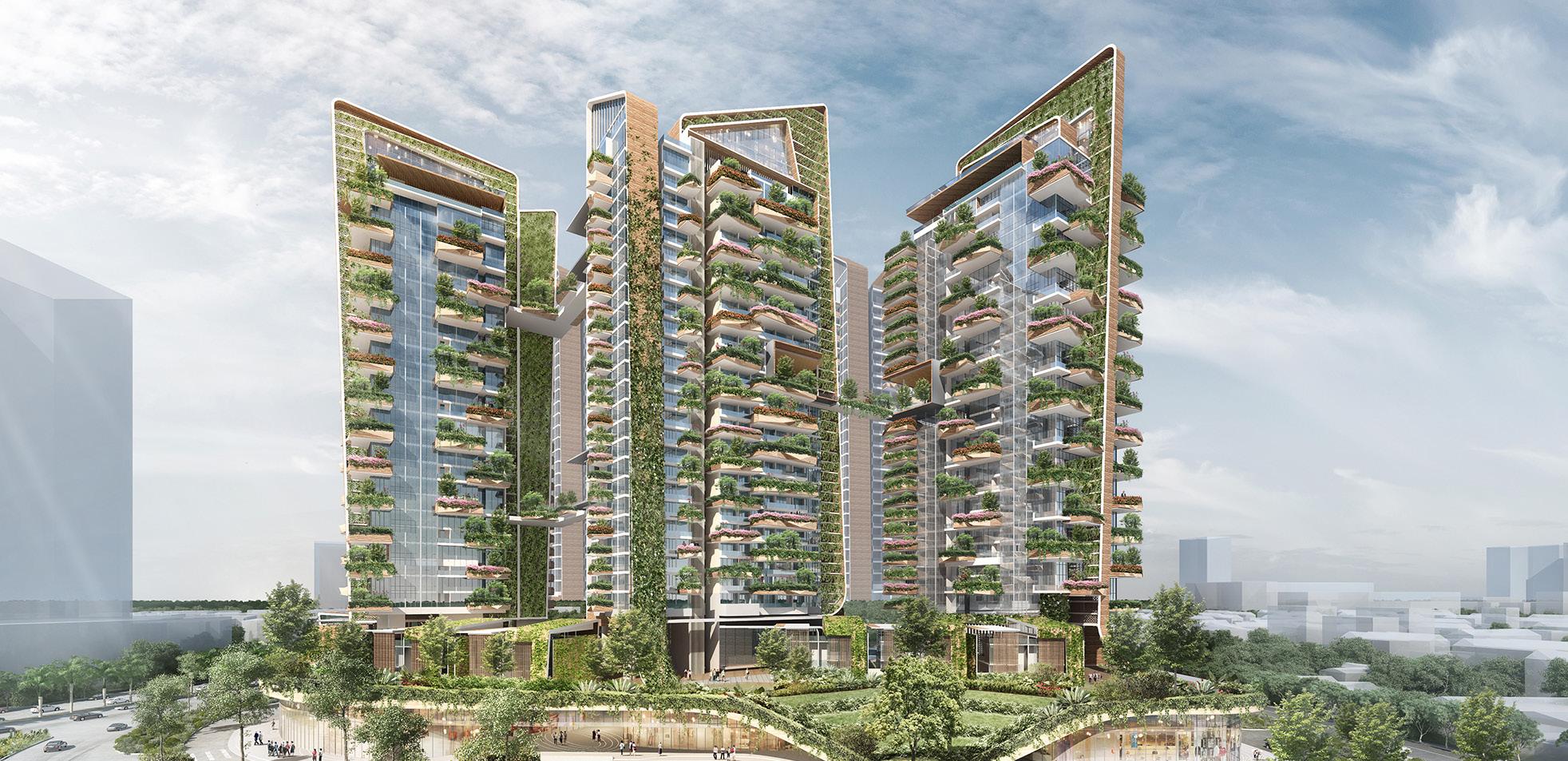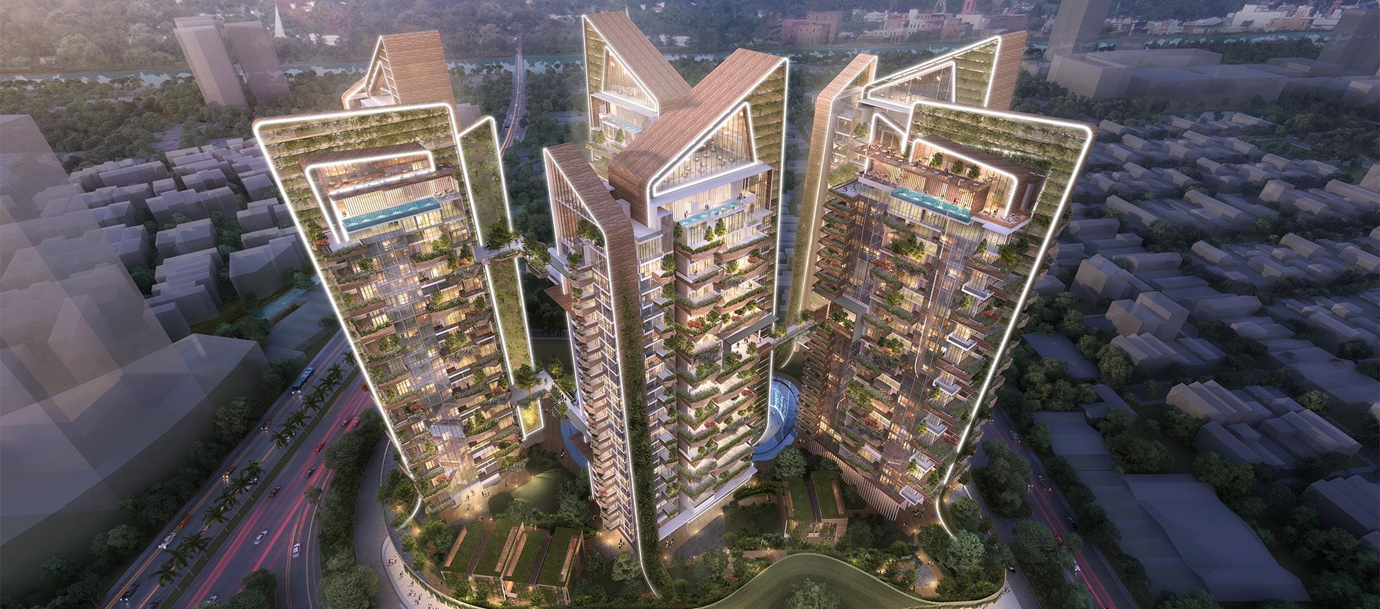 Jinchen Villas are designed with generous proportions and high quality materials, and take inspiration from Chinese bronze pots, with each of its three towers sitting on sturdy legs, the bowed bronze solar screen resembling the body of the pot and the duplex penthouses narrowing to form the neck.