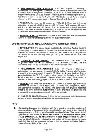 3. REQUIREMENTS FOR ADMISSION: B.Sc. with Physics / Chemistry / Mathematics from a recognised University OR B.Sc. in Life Sciences with Physics as a subject from a recognised University OR B.Sc. in Nuclear Medicine from a recognised University OR B.Sc. in allied / related subject i.e. Radiodiagnosis(MRT) / Radiotherapy from a recognised University. Candidates should have scored a minimum of 50% marks in aggregate in Science Subjects at B.Sc. level. 4. AGE LIMIT: Not more than 35 years as on 1st May 2019. Upper age limit can be relaxed in the case of SC/ST (5 Years), OBC (3 Years), PWD category (10 Years) and Sponsored candidates (10 Years). The candidates with physical disabilities limited to the lower extremities but permitting to stand and move and physically able to carry out the course requirements only, will be considered. 5. NUMBER OF SEATS: Maximum 10 (Ten) (5-Non-sponsored and 5-Sponsored). Number of seats indicated are provisional and subject to variation. COURSE (3): DIPLOMA IN MEDICAL RADIOISOTOPE TECHNIQUES (DMRIT) 1. INTRODUCTION: This course equips candidates for working as Nuclear Medicine Technologists in Nuclear Medicine Centres. The course will comprise of a full-time schedule of lectures, demonstration, practicals and apprenticeship programmes. Candidates should not hold any other job during the course, or join any other programme. 2. DURATION OF THE COURSE: One Academic Year (2019-2020). This programme shall be of one academic year duration consisting of two semesters. There will be examination at the end of every semester. 3. REQUIREMENTS FOR ADMISSION: B.Sc. with Physics / Chemistry / Mathematics from a recognised University OR B.Sc. in Life Sciences with Physics as a subject from a recognised University OR B.Sc. in Nuclear Medicine from a recognised University OR B.Sc. in allied / related subject i.e. Radiodiagnosis (MRT) / Radiotherapy from a recognised University. Candidates should have scored a minimum of 50% marks in aggregate in Science Subjects at the B.Sc. level. 4. AGE LIMIT: Not more than 35 years as on 1st May 2019. Upper age limit can be relaxed in the case of SC/ST (5 Years), OBC (3 Years), PWD category (10 Years) and Sponsored candidates (10 Years). The candidates with physical disabilities limited to the lower extremities but permitting to stand and move and physically able to carry out the course requirements only, will be considered. 5. NUMBER OF SEATS: Maximum 5 (Five) (3 Non-sponsored and 2 Sponsored). Number of seats indicated are provisional and subject to variation. NOTE:1.