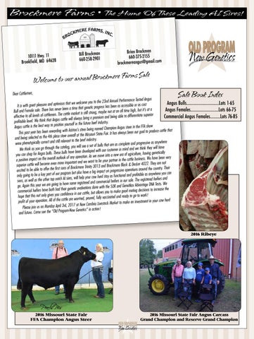 ormance Tested Angus come you to the 23nd Annual Perf wel we that Angus Bulls………………………..Lots 1-65 m mis opti and sure ssible or as cost It is with great plea genetic progress has been as acce that time a n bee er nev a has at re it’s The Angus Females…………………….Lots 66-75 Bull and Female sale. be not at an all time high, but The cattle market is still strong, may erior sup iate rent diffe to able g effective to all levels of cattlemen. bein Commercial Angus Females………Lots 76-85 ium and us cattle will always bring a prem profitable level. We think that Ang . stry ition yourself in the future beef indu show Angus cattle is the best way to pos Champion Angus steer in the FFA ed nam g with Ashton’s steer bein ng ardi produce cattle that rew n to l bee goa has r our n yea t bee pas This State Fair. It has always ri sou Mis the at rall ove r stee e and being selected as the 4th plac relevant to the beef industry. were phenotypically correct and still and progressive as anywhere a set of bulls that are as complete see will you log, cata the ugh thro mind and we think they will have We think as you go n developed with our customer in bee e hav s bull se The s. bull us of agriculture, having genetically you can shop for Ang ration. As we move into a new era ope any of ook outl rall ove the cattle business. We have been very a positive impact on we want to be your partner in the and nt orta imp e mor n eve ome & Decker 4022. They are not superior cattle will bec Trinity 3013 and Brockmere Black ere ckm Bro ir of s son first the r offe operations around the country. The excited to be able to have a big impact on progressive also but can ram you prog re our whe of any part as le only going to be a key stay as functional and profitab h AI sires, will help your cow herd our sale. The registered heifers and sons, as well as the other top notc stered and commercial heifers in regi e som e hav to g goin are we x Advantage DNA Tests. We go. Again this year ions done with the 50K and GeneMa luat eva etic gen r thei had both e mating decisions to increase the commercial heifers hav le, but allows you to make good catt our in nce fide con you s give y to go to work! hope that this not only , poured, fully vaccinated and read med wor are le catt the of All n. stment in your cow herd profit of your operatio Livestock Market to make an inve bria Cam New at 7 201 , 3rd l Please join us on Monday Apri ram-New Genetics” in action! and future. Come see the “Old Prog