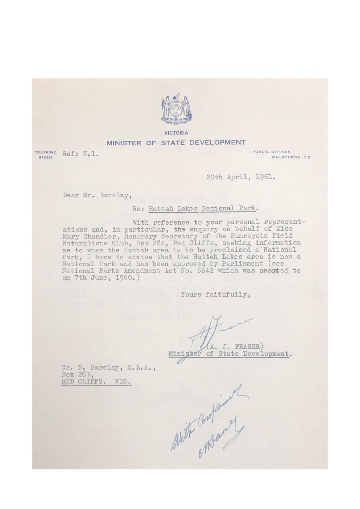With reference to your personal representations and, in particular, the enquiry on behalf of Miss Mary Chandler, Honorary Secretary of the Sunraysia Field Naturalists Club, Box 284, Red Cliffs, seeking information as to when the Hattah area is to be proclaimed a National Park, I have to advise that the Hattah Lakes area is now a National Park and has been approved by Parliament (see National Parks Amendment Act No. 6642 which was assented to on 7th June, 1960).