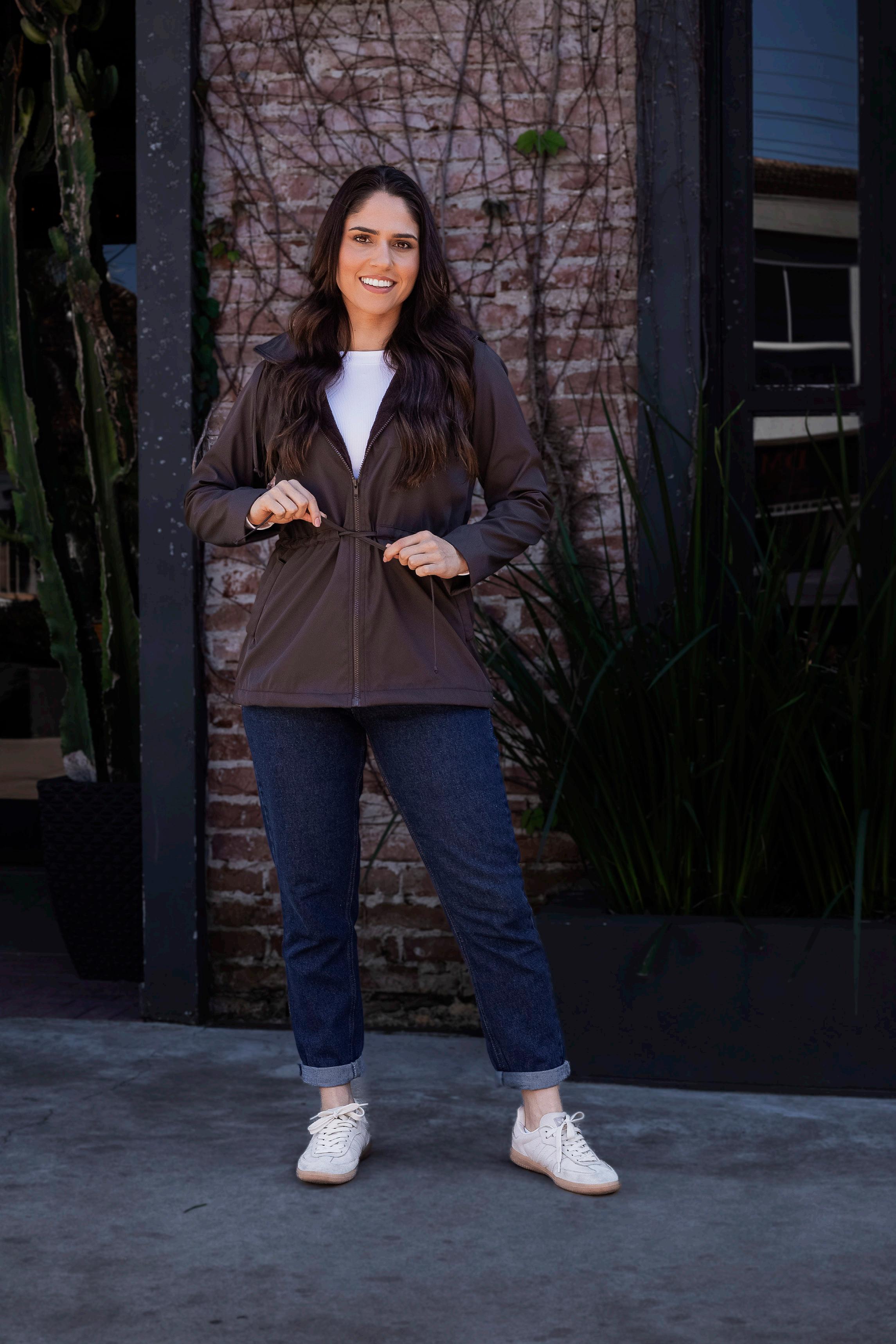 LOGO: TRANSFER FLIEGEN EM COURO PU COM BOLSOS | CAPUZ COM FORRO | FRENTES COM DETALHES EM RECORTE | COBRE GOLA INTERNO PERSONALIZADO