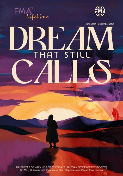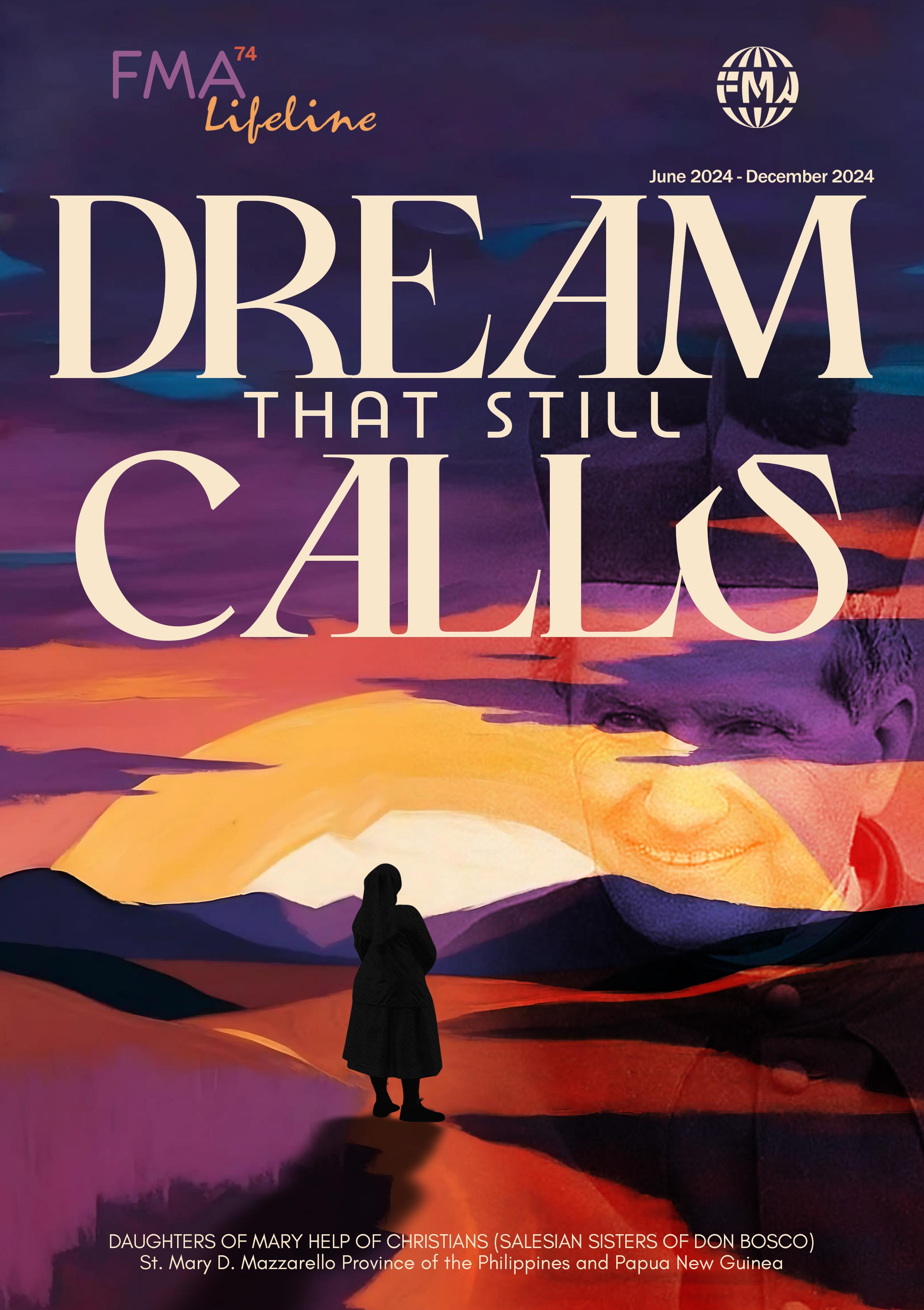 The magazine cover features the theme “DREAM THAT STILL CALLS,” which is the title of Circular Letter No. 1038 by Mother Chiara Cazzuola, FMA. The image depicts a silhouetted FMA figure standing against a landscape with a partial overlay of a portrait, suggesting a connection between the individual, the dream, and the legacy of the Daughters of Mary Help of Christians in the Philippines and Papua New Guinea. The cover conveys a message of inspiration and continuity, linking the present to the enduring vision of the Institute.