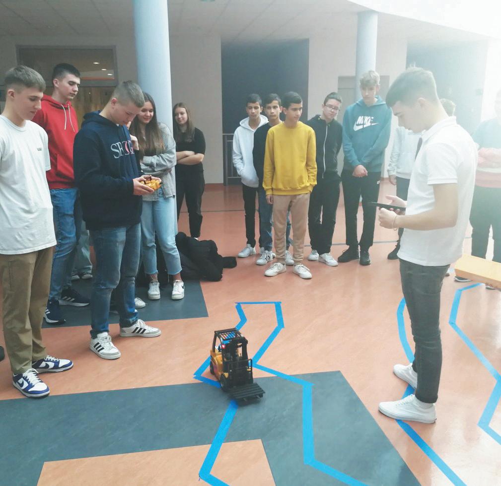 Jedną z atrakcji tego dnia były zawody w obsłu dze urządzeń transportowo – manipulacyjnych, tj. wózka widłowego i ciągnika siodłowego z na czepą (modeli zdalnie sterowanych). Uczniowie klas pierwszych pokonywali tor przeszkód na czas tymi urządzeniami, wcielając sie w rolę przyszłych magazynierów lub kierowców samochodów cięża rowych.