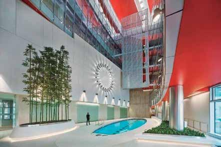 Su sistema involucra miles de dispositivos que alimentan un poderoso “centro nervioso” de computadora que rastrea el uso de energía y coordina el calentamiento, enfriamiento y otras operaciones. Las ventanas se oscurecen automáticamente cuando hace calor afuera y se abren para permitir el flujo de aire fresco. El aire circula a través de un laberinto de concreto de un cuarto de milla de largo, 12 pies debajo del edificio, proporcionando calefacción y refrigeración pasivas; el laberinto tiende a ser más frío que el aire exterior en verano y más cálido en el invierno. Una piscina en el centro del gran atrio del edificio absorbe el exceso de calor y también se puede usar para nadar.