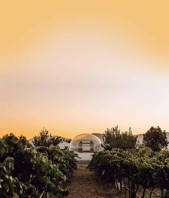 Campera Hotel es un espacio único rodeado de viñedos con doce burbujas suites únicas que brindan vistas de 180° a los fascinantes paisajes del Valle de Guadalupe. Gran ambiente para parejas y conversaciones íntimas.