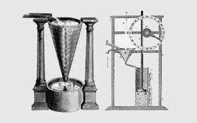 ritmo específico a otro recipiente con una pipeta axial. Cuando este segundo recipiente se llenaba, su agua caía rápidamente en un tercer recipiente cerrado, lo que obligaba al aire a salir silbando a través de un tubo. Este podría haber sido el primer dispositivo para despertar conocido en la historia humana.