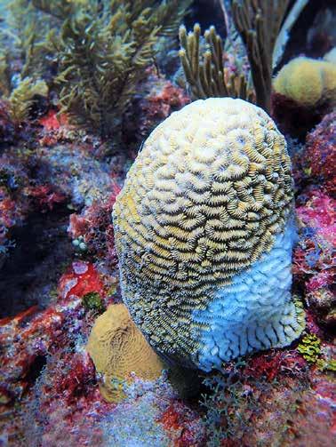 A pesar de mantener una cobertura de coral estable, las principales especies constructoras de arrecifes, como corales cerebro y pilares, han disminuido un 44% durante la última década, reduciendo a su vez la acumulación de carbonatos, la protección costera y la resiliencia de los arrecifes. El brote actual de la enfermedad de pérdida de tejido en corales duros (síndrome blanco) ha diezmado especies críticas de corales constructores del arrecife, reduciendo la complejidad del hábitat y la producción de carbonato. Probablemente es la perturbación más letal en el Caribe.