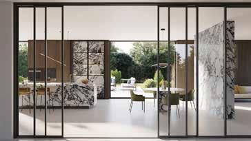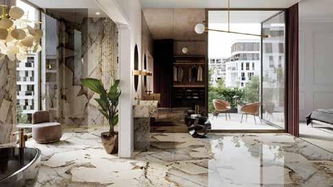 La combinación de materiales en tonalidades terrosas crea estilismos de interiores muy variados: desde ambientes más vanguardistas, con Fitwall® Wave White Sand (Krion®), hasta los más opulentos, con la estética imponente de la piedra natural Pangea de Altissima, de XTONE. Los sillones de terciopelo, los accesorios de cerámica, los jarrones