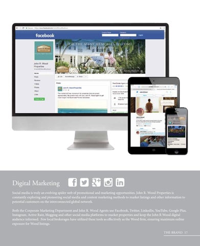 Digital Marketing Social media is truly an evolving spider web of promotional and marketing opportunities. John R. Wood Properties is constantly exploring and pioneering social media and content marketing methods to market listings and other information to potential customers on the interconnected global network. Both the Corporate Marketing Department and John R. Wood Agents use Facebook, Twitter, LinkedIn, YouTube, Google Plus, Instagram, Active Rain, blogging and other social media platforms to market properties and keep the John R Wood digital audience informed. Few local brokerages have utilized these tools as effectively as the Wood firm, ensuring maximum online exposure for Wood listings. THE BRAND 17