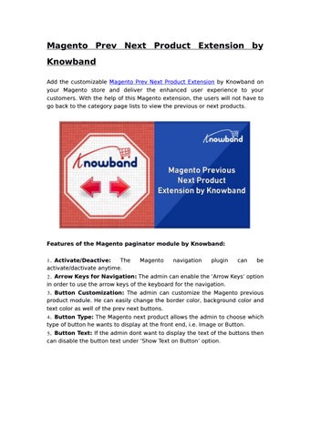 Magento Prev Next Product Extension by Knowband Add the customizable Magento Prev Next Product Extension by Knowband on your Magento store and deliver the enhanced user experience to your customers. With the help of this Magento extension, the users will not have to go back to the category page lists to view the previous or next products.