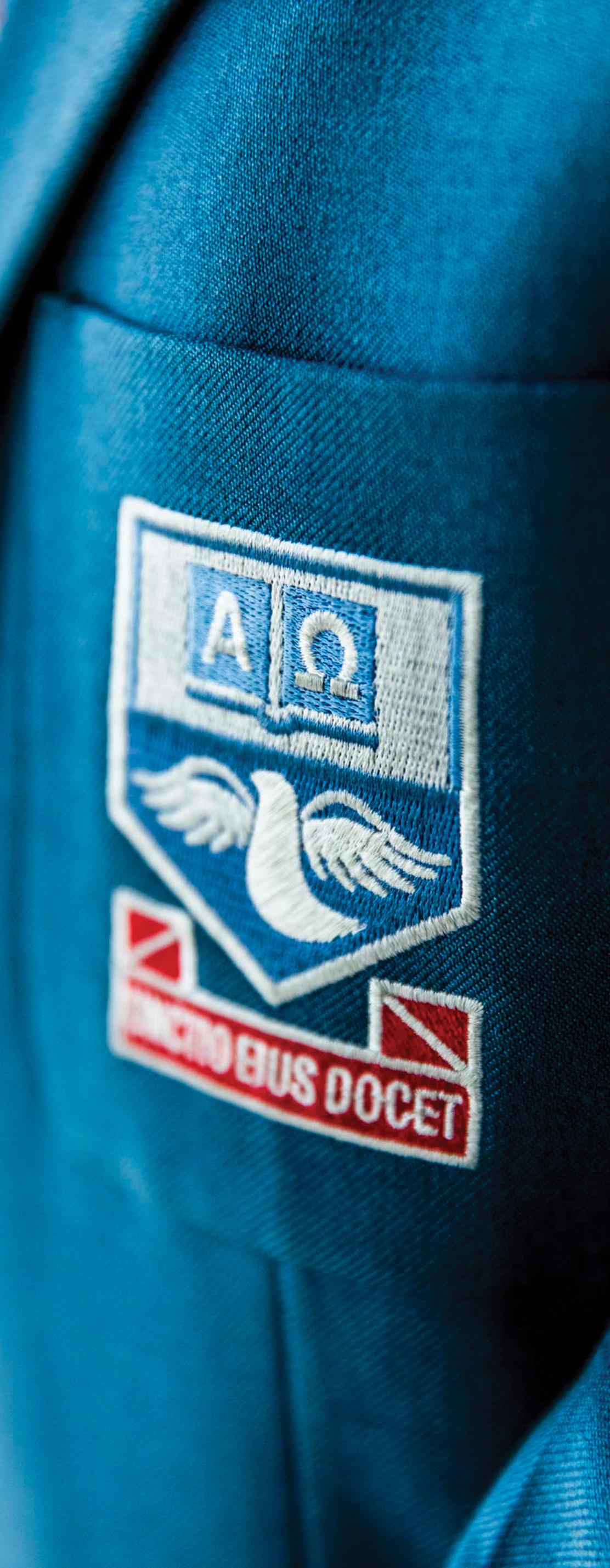 Our crest incorporates a shield with an open Bible, a dove, and a scroll bearing the college motto. The letters on the Bible, Alpha and Omega, are the first and last letters of the Greek alphabet and refer to the beginning and the end, a name given to Christ.