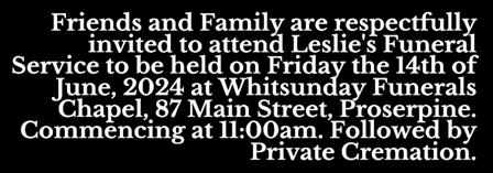 Friends and Family are respectfully advised of Gary’s passing. Gary’s Service is to be held on Tuesday the 25th June, 2024 at Whitsunday Funerals Chapel, 209 Shakespeare Street, Mackay. Commencing at 11am