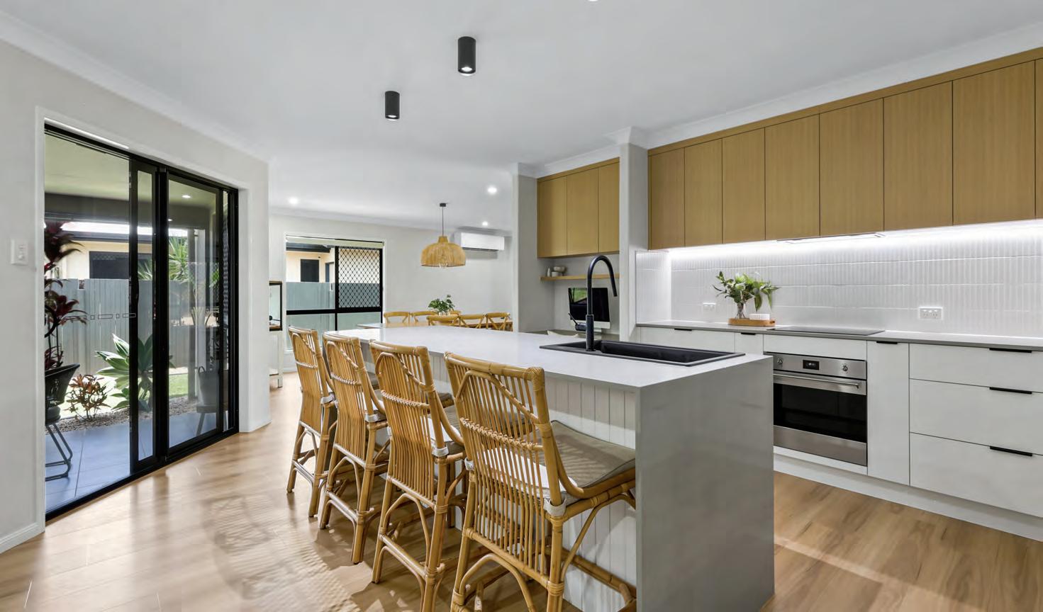 • Contemporary kitchen featuring stone benchtops, timber accents, and generous storage, complete with cleverly designed appliance cupboards.