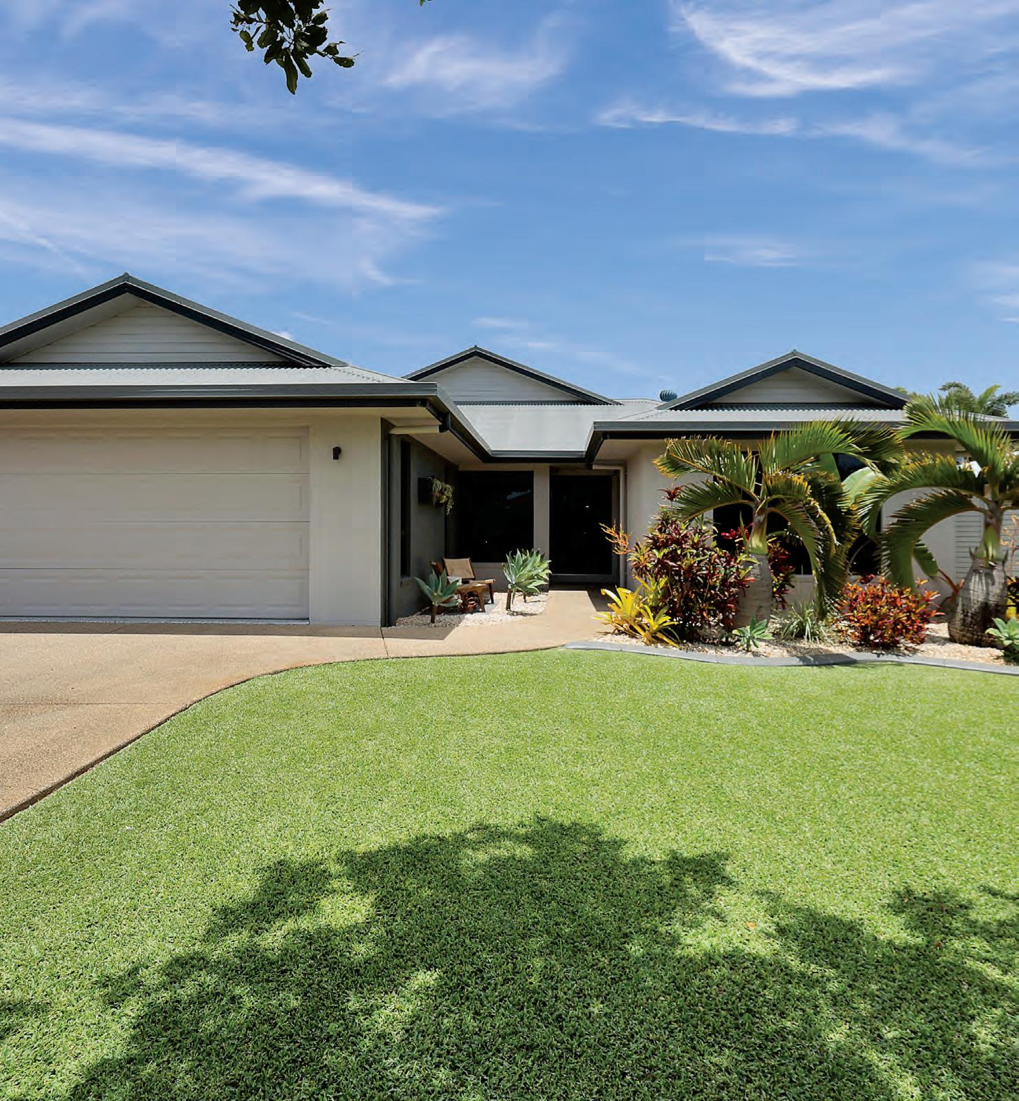 • Low set rendered home with a large timber entrance door framed by tropical plants, provides a welcoming resort feel.