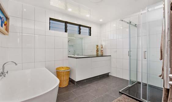 The large family bathroom boasts stone benchtops, floor-to-ceiling tiles, and a separate bath & shower with a private toilet nearby. Stone benchtops also feature in the smartly configured laundry room.