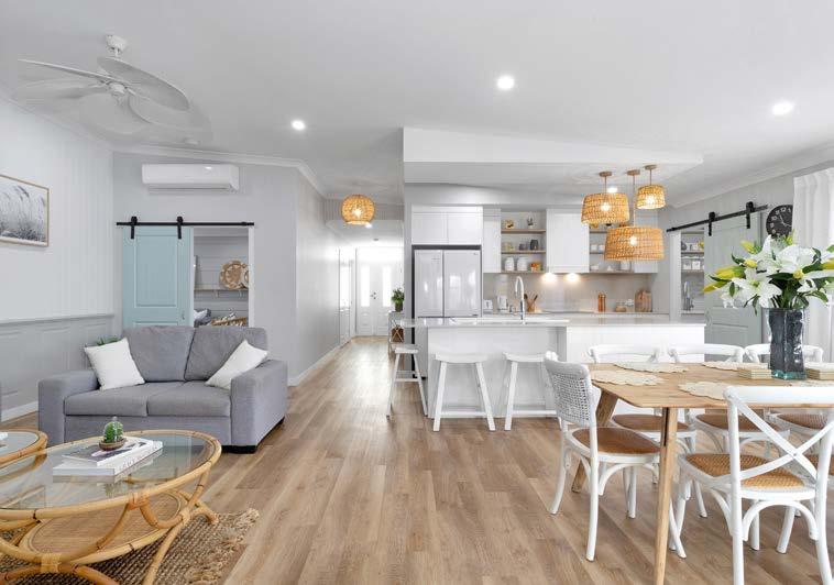 A huge open-plan living zone and a stunning kitchen with a butler’s pantry, stone benchtops, a large, plumbed fridge space, a full breakfast bar, modern streamlined cabinetry, and quality appliances rest at the hub of the home.