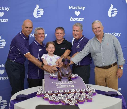As passengers arrived at the Mackay terminal, players from the Mackay Cutters greeted them on arrival dressed in bright purple Bonza budgie smugglers before a celebratory cake was cut to mark the momentous occasion.