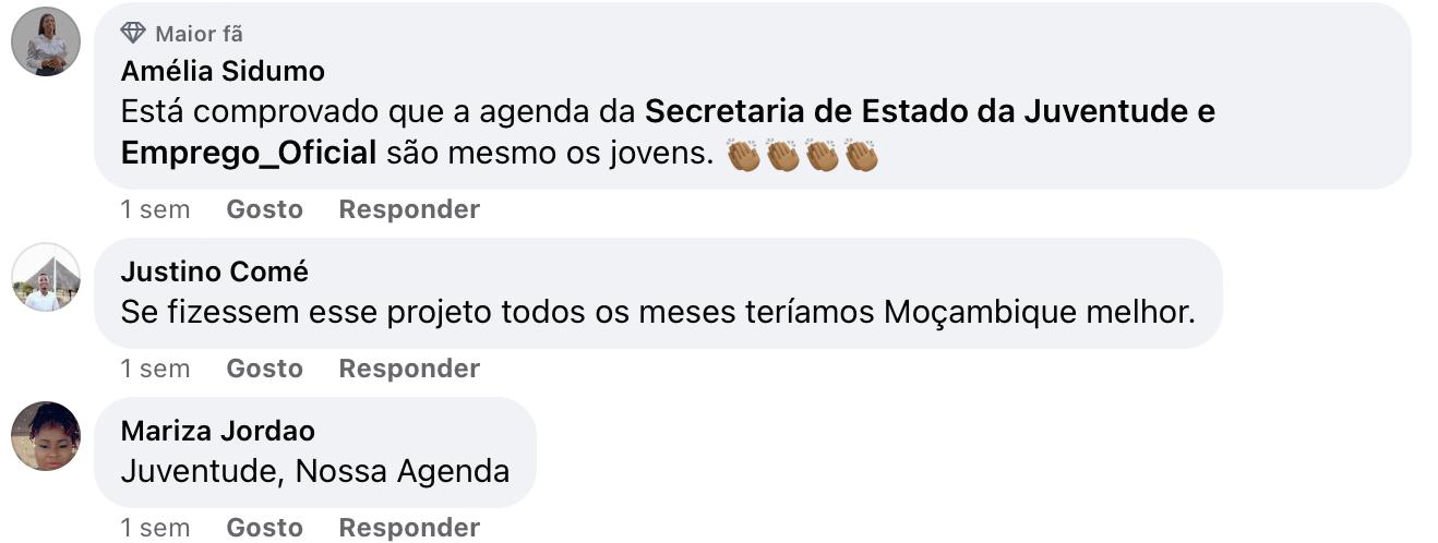 ´´De 2020 a esta parte lançamos e implementamos o programa Eu Sou Capaz, Construímos, modernizamos e apetrechamos os nossos Centros de Formação Profissional, implantamos incubadoras de empoderamento juvenil, promovemos estágios remunerados e não remunerados, atribuímos Kits através do programa Meu Kit, Meu Emprego, financiamos jovens através do Fundo de apoio às iniciativas Juvenis (FAIJ) e implementamos o programa Emprega nas suas componentes, Agora Emprega e Acredita Emprega, entre outros programas de impacto directo para vida das famílias Moçambicanas e em particular dos Jovens´´