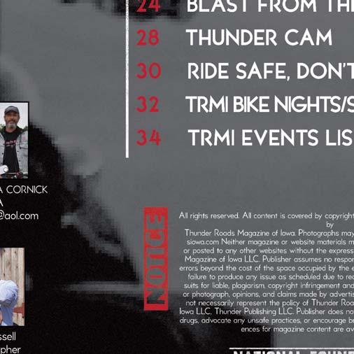readers. We are asking for some submissions for the Thunder Cam page in the magazine. If you have any great shots that you would like considered for print on our pages, email them to vernon@thunderroadsiowa. com. We give no guarantee that what you send will be used, but look forward to seeing what ya got! Please send them in high resolution so that they can be printed, and no logos, watermarks, text, or dates added to them. If there is anyone that submits on a regular basis to us, you could end up on the contributor list on the staff page if you are so inclined. Thanks in advance, and we hope to start seeing some stuff from our loyal readers!
