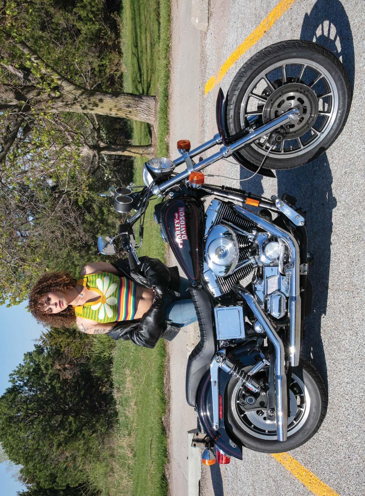 A great pair, Hayley and the Dyna C. Hayley grew up on the back of her mom’s Harley. Her mom rode a 2004 HarleyDavidson Sporty and that is where it started for Hayley. She now owns and continues to ride this same motorcycle. All of Hayley’s close friends that have become family ride. They just returned from the Freedom Rally. Hayley is adorning Mark Fountain’s 1999 Dyna Convertible. He wanted a used bike for quick trips in and around town. His buddy Don found him this clean bike, and after a trip to Butterfield’s M-C Parts and then over to Harley Joe’s for some slight changes, it was nice and roadworthy. For these photos, all of the “convertible” parts were taken off for a cleaner look. Mark’s photo work can be found on Facebook at Fountain Photography or fountainphoto. net, worth a look for some of his amazing work.