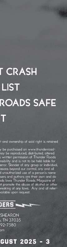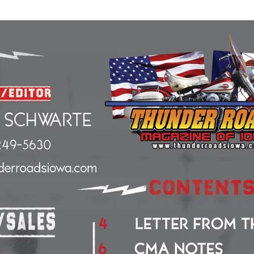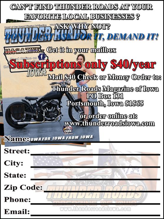 We would like to thank our faithful sponsors for being a part of this magazine. Without our advertisers, we could not publish Thunder Roads Magazine of Iowa each month. We have been doing so since June of 2010, and hope to keep doing so for many years to come. Darken the doorway of our advertisers and tell them that TRMI sent you! If you have a business or something you would like to advertise in Thunder Roads or know of a spot that should be on our pages, let us know. Give me or any of the staff a call or email and we can try to get them hooked up! Thanks tons, have a great month, ride safe!