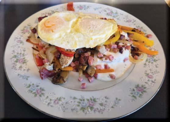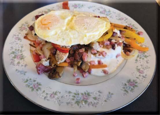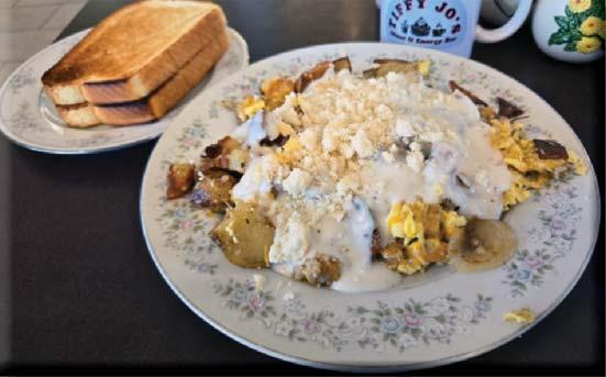 Vernon ordered the Loaded Biscuits and Gravy, and it arrived as a huge plate of breakfast goodness. Two fluffy biscuits covered with traditional sausage gravy comprised the bottom layer. This is where the magic happens and turns B&G into something spectacular…atop the creamy gravy was generous helpings of crispy bacon, tender sausage, ham, colorful bell peppers, onions, mushrooms, and two eggs cooked “your way”. Vernon ordered his eggs cooked overmedium, and they arrived perfectly cooked. I ordered the Country Shipwreck on this visit, and I was not disappointed. My meal arrived piled high on my plate and fresh as could be. Perfectly seasoned country potatoes on the bottom (you can choose hashbrowns if you want), topped with sausage, onion, cheddar jack cheese, fluffy scrambled eggs, and creamy country gravy. Crumbled biscuit topped the allinclusive breakfast dish. I opted for the side of sourdough toast for my meal, but you can substitute pancakes or French toast if you think you have the stomach space… we did not have the space, but I wish we had. I guess that just means we will be returning to try more of the delicious offerings at Tiffy Jo’s next time we are in Cedar Rapids.