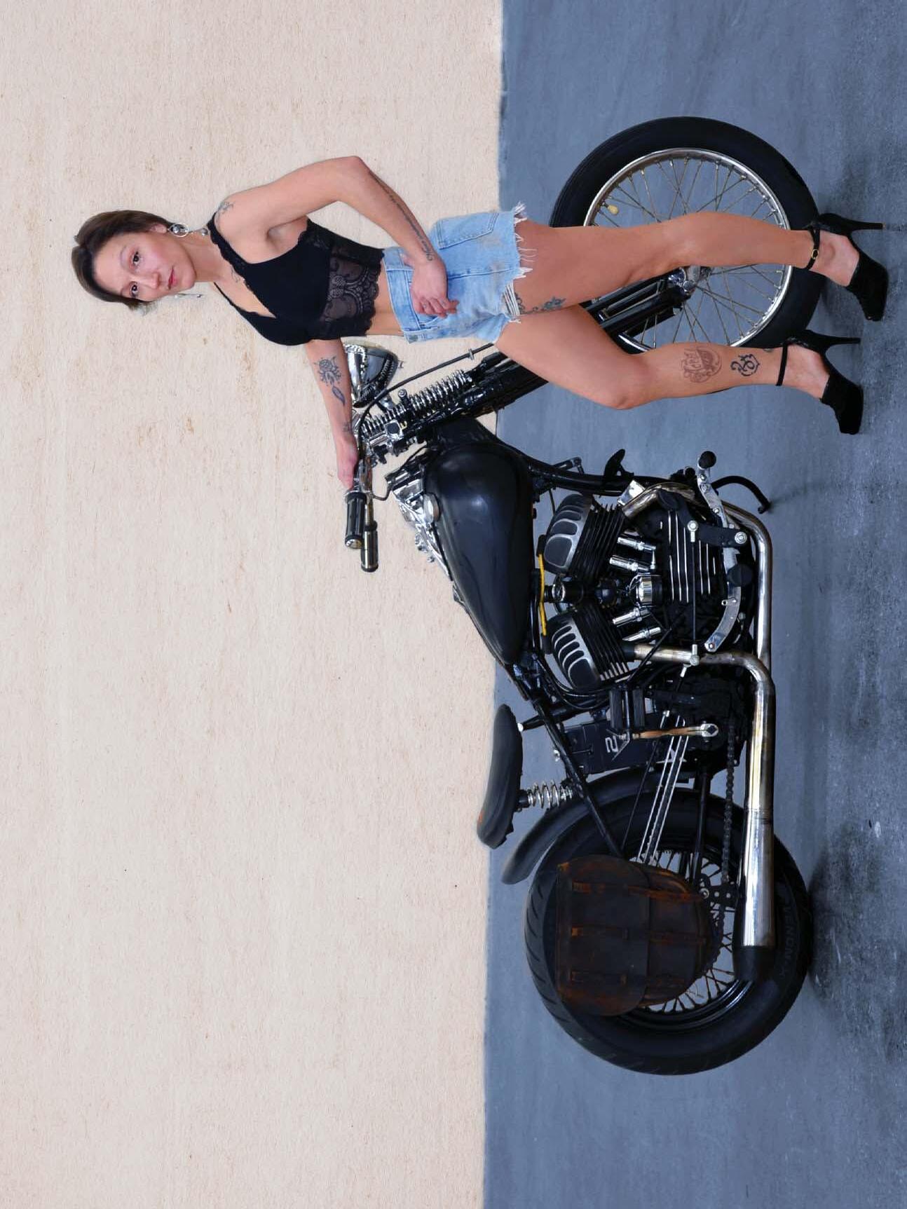 This month we are bringing you a couple images of cute as a bug Tiffany with Glen McLaughlin’s BADASS 45 Inch Flattie. This lightly (understatment) modified side valve is dripping of antique motorcycle cool factor. Not much on this critter has not been modified or improved. Tiffany agreed to model and did a fantabulous job, all while working hard to NOT be late for her regular gig running the show at Village Court Family Restaurant.