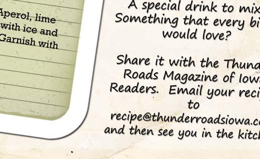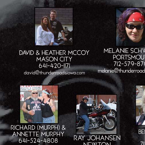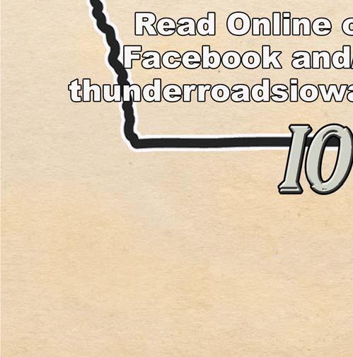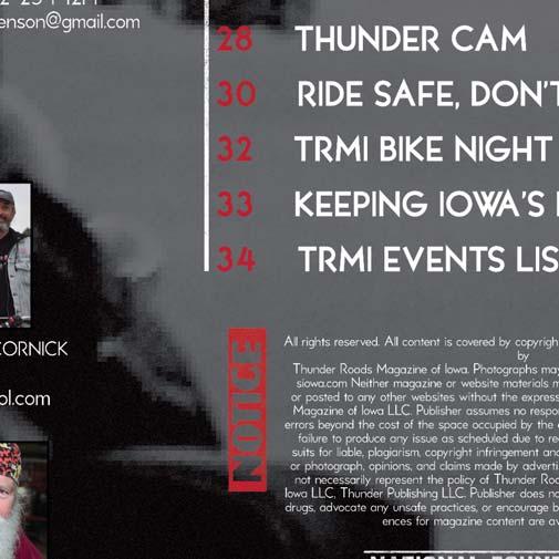 you know of anything confirmed from now through next riding season, let us know. Email the date, name of the event, and starting location town to vernon@ thunderroadsiowa. com magazine of Iowa. We publish this list every month toward the back of the magazine, and during riding season also have the Thunder Roads Magazine of Iowa Bike Night/ Supper Ride list. We are always looking for those also. We appreciate the help on this, so that we can keep the most comprehensive list possible. Hope to see you out on the road in these waning months of riding season!