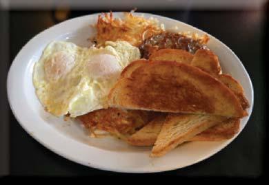 Brad ordered the French Toast Plate which came loaded with three full slices of sweet, cinnamon-y French toast with the perfect ratio of crisp outside to soft inside. Paired with butter and maple syrup, it hardly needed the two savory sausage patties that accompanied the plate. Stacey ordered the Ultimate Skillet that came piled high with crisp country potatoes, diced ham, onions, green peppers, mushrooms, bacon, sausage, cheese, two eggs cooked your way, and choice of toast. Stacey requested eggs over easy and sourdough toast. The Ultimate skillet was aptly named, a HUGE portion of breakfast faves in one dish! Vernon went with the chicken fried steak skillet, and that was another excellent choice. His skillet arrived piping hot and piled high with those crispy country potatoes, chunks of crisp and tender country fried steak, creamy sausage gravy, two eggs (over medium), and perfectly toasted wheat bread. This skillet option was also a very generous portion…so bring your appetite. I ordered the All-American Platter. This platter consists of two eggs your way, choice of meat, choice of toast, all piled on a sizable portion of crisp hashbrowns. I ordered my eggs over medium and opted for sausage as my meat. Sourdough toast completed my breakfast platter and it was the perfect buttery option to dip in my egg yolks.