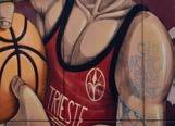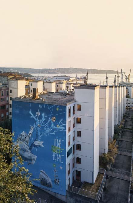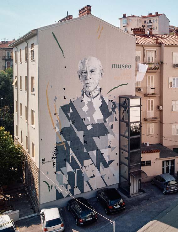 piano e guardando giù, si noteranno dei mosaici che ricordano le province della Venezia Giulia tra le due guerre. La forma artistica è impressionante, ma è la sua posizione seminascosta agli occhi di chiunque a renderla interessante; così come lo è il grande murales che ricorda una delle redazioni de Il Piccolo, storico quotidiano della città fondato a fine Ottocento, e che in piazza Goldoni, seppure scolorito, fa bella mostra di sé. Potrebbe risuonare alla stregua di una caccia al tesoro, l’operazione triestina dei murales. Ci sono segni che rimangono appiccicati a pareti di edifici dismessi, di quelli che un tempo ospitavano grandi idee imprenditoriali. È il caso, ad esempio, della targa che in pendice dello Scoglietto, nel rione di Cologna, ricorda la prima bottega di Ottavio Missoni. Il maglificio Venjulia non esiste più, ma in quella stradina stretta in discesa si trovano gli albori dell’impero della moda realizzato dallo stilista di origine dalmata. La targa è lì, affissa ad una colonna di cemento, dimenticata dai più e nascosta alla vista dei tanti. Rappresentano vicende passate che in questa città hanno avuto impatti culturali più o meno considerati. Ma le forme d’arte su strada nascono anche in periodi difficili e