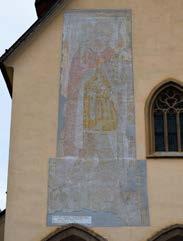 unbesiegbare Kaiser Karl V., Erzherzog von Österreich und Burgund (...) mit 80.000 Mann zu Pferd und zu Fuß mit 17 Truppen hier vorbei und übernachtete im Markt Tarvis. Er nahm auch persönlich an einer Andacht teil. Das Fresko wurde im Jahre 1562 vom edlen und ehrbaren Landvogt und Gegenschreiber Christof Guggenberg zusammen mit der ehrenwerten Gemeinde Tarvis in Auftrag gegeben.”
